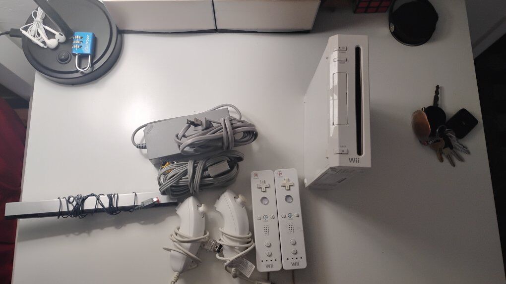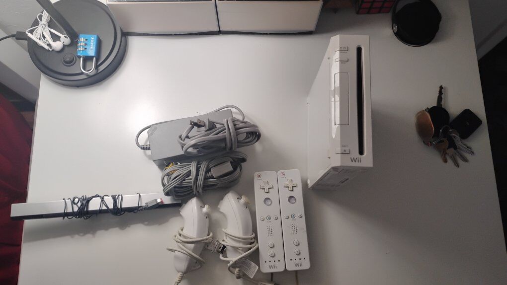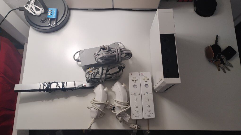 Includes: Wii console Power cord & AV cables Sensor bar 2 Wii Remote (with wrist strap) 2 Nunchuk Asking $75 OBO. Cash preferred. Message me with any questions!