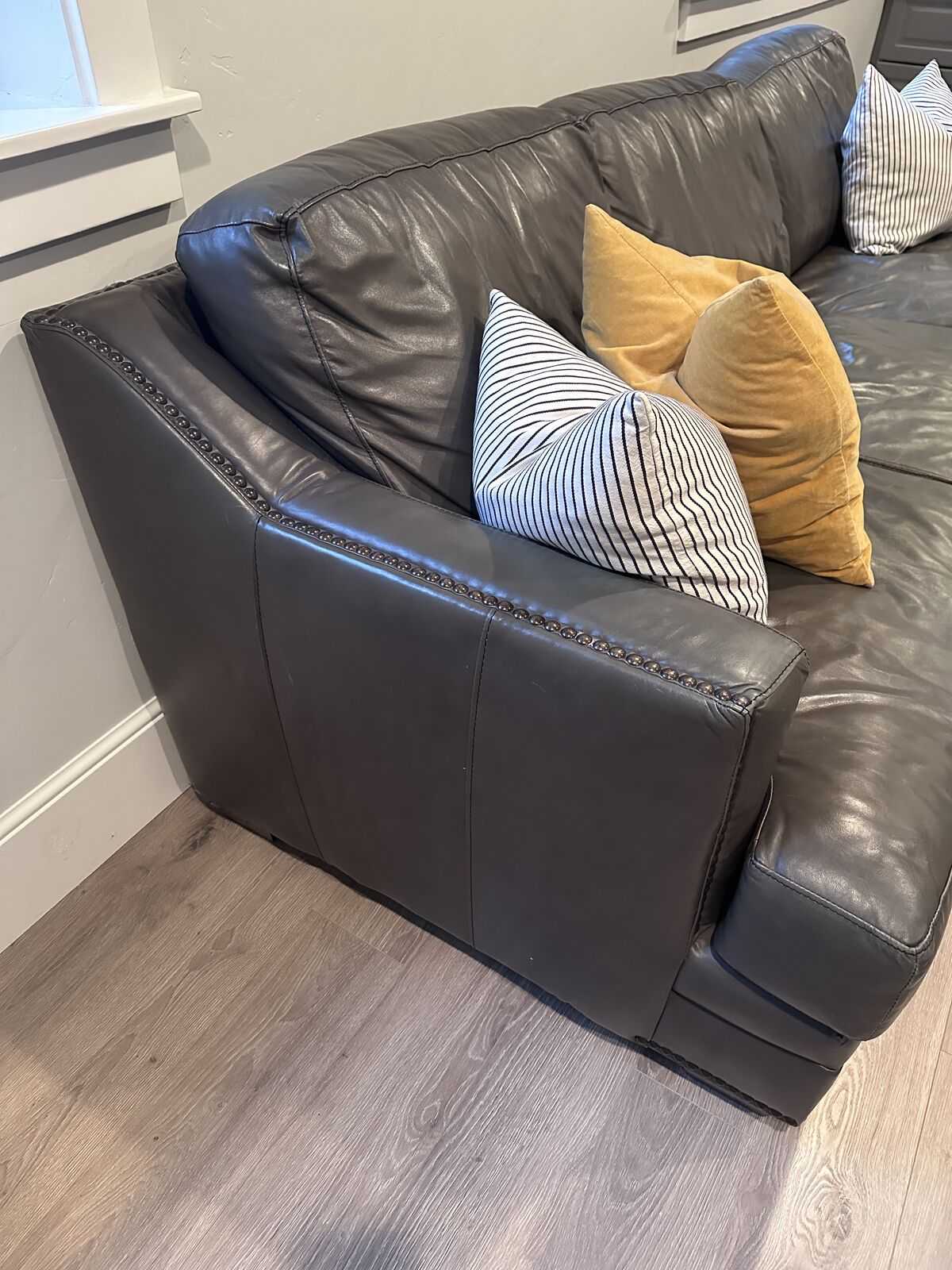VenmoThis comfortable sofa is in great condition. It's a nice green/gray color with nailhead detailing. 96" long, 39" deep, 32" high.