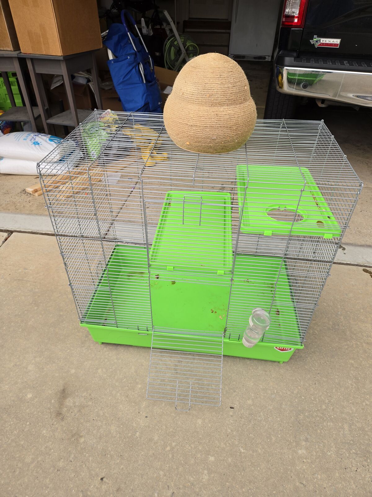 Large cage for rats, guinea pig, chinchilla, ferret or what have you. Comes with water bottle and house. Nice cage!