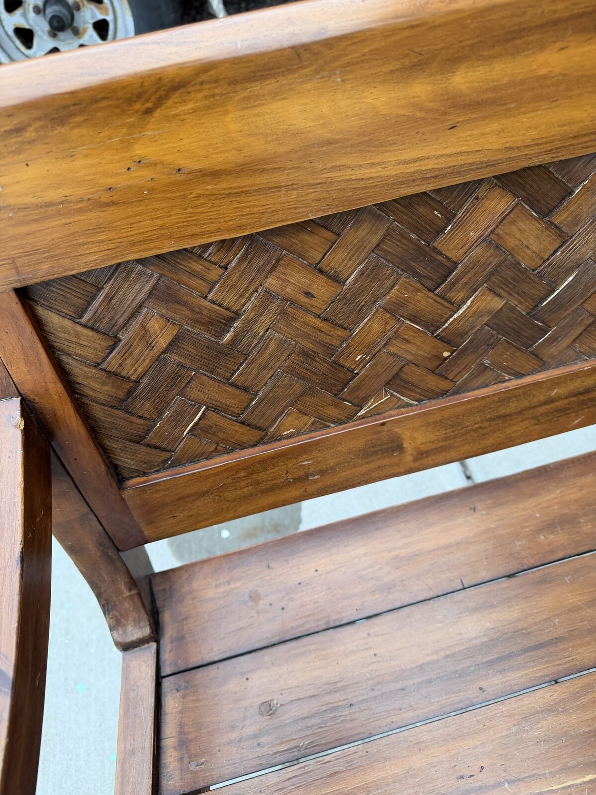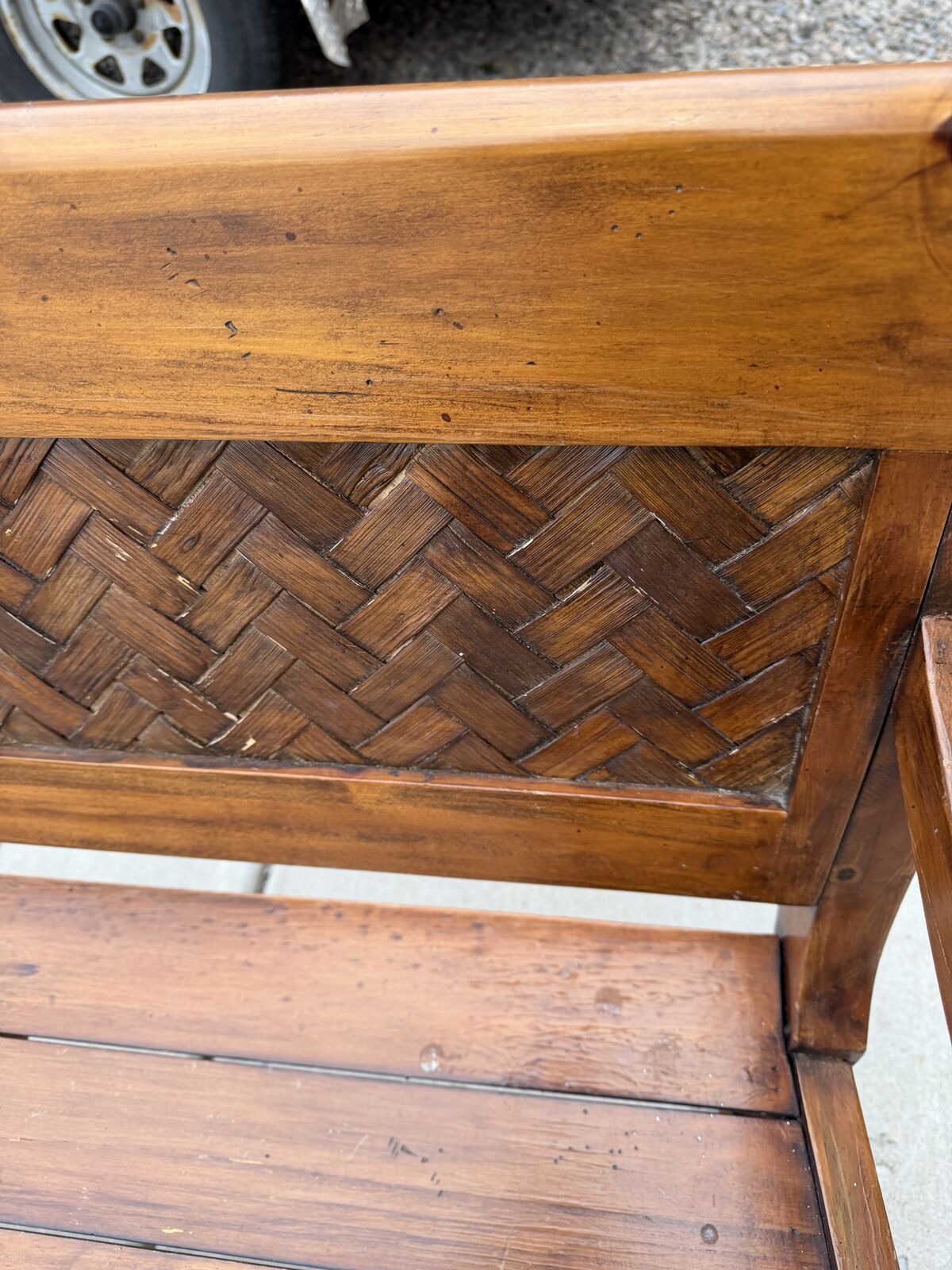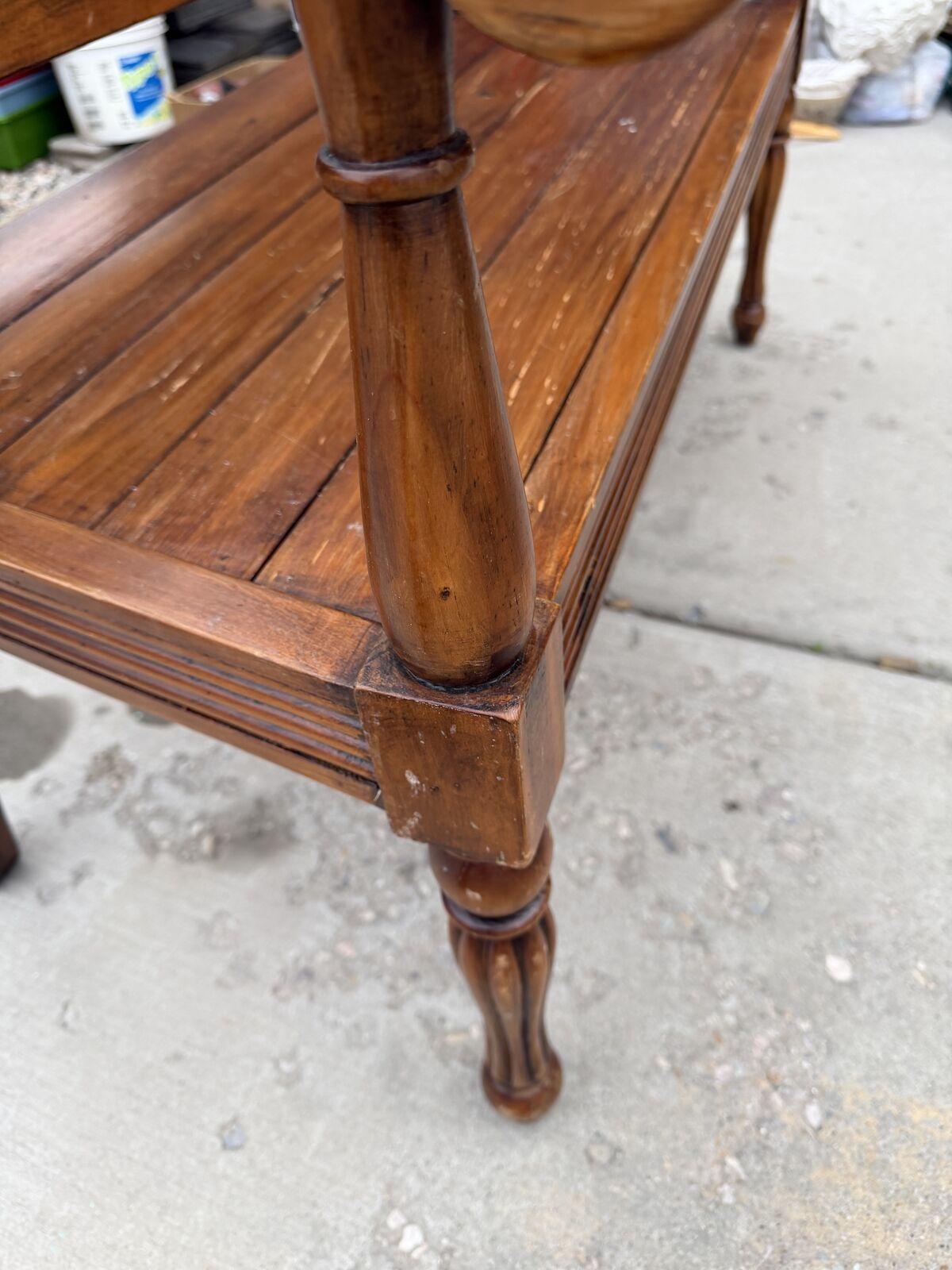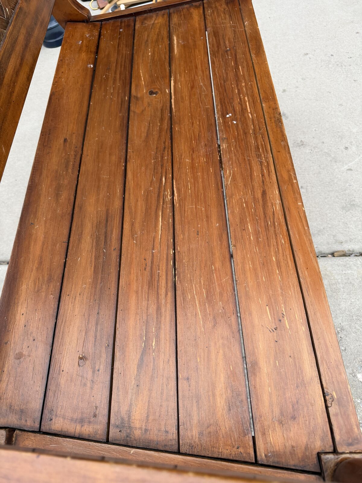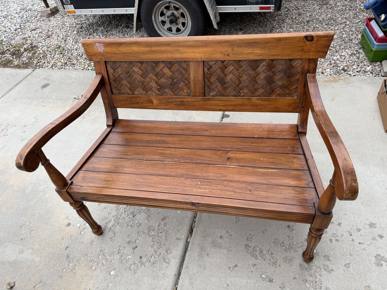 ApplePayGreat sturdy wood bench for porch patio. Measures 45 inches long approximately 24 inches wide and the seat is 17 inches high.