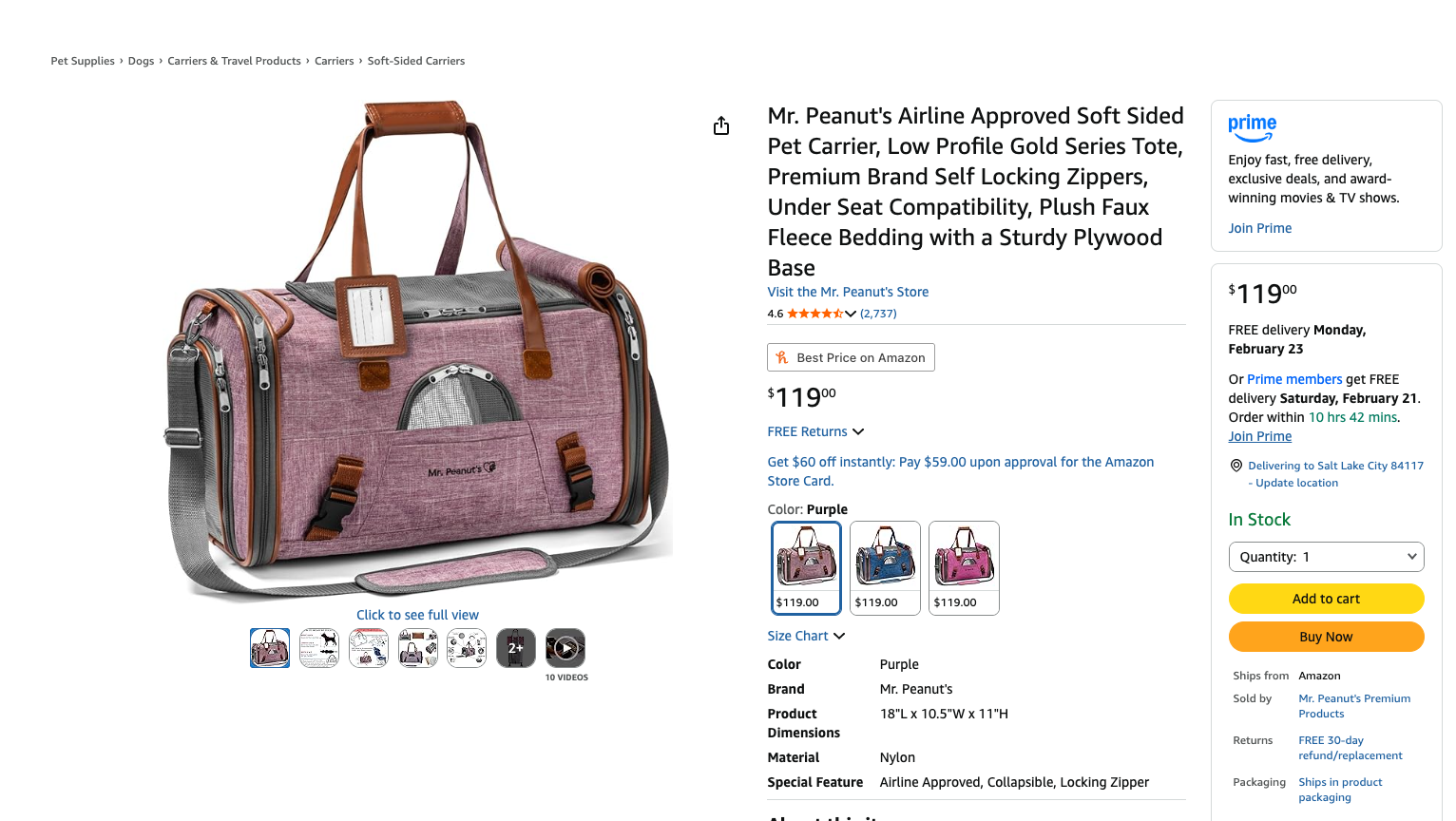 In like new condition, sells on Amazon for $119. Collapsible with its own storage bag. please see photos for all details on correct sizing for your pet. Great for airline travel.