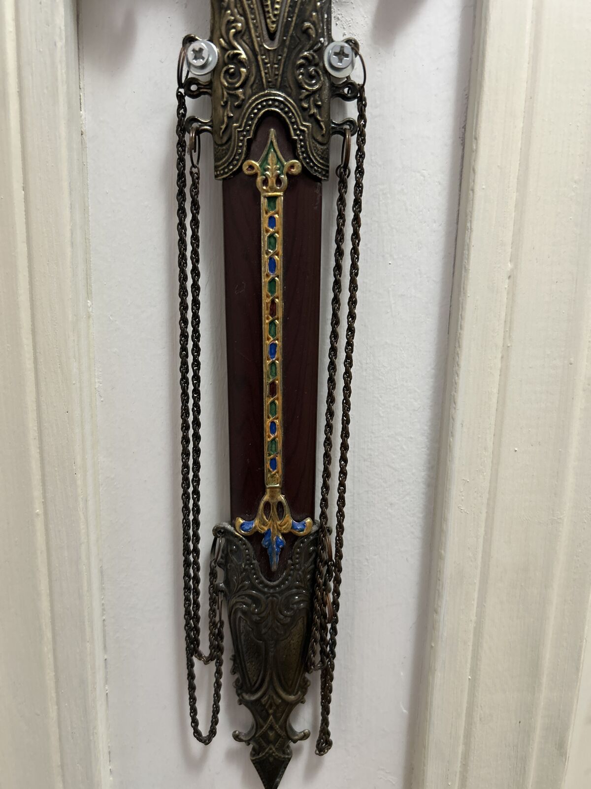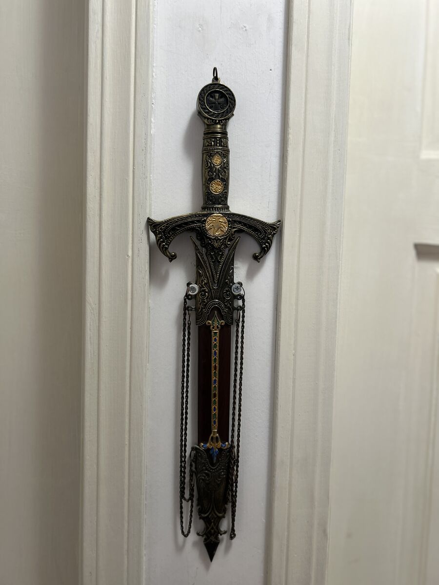 Size: approx. 17" long × 5" wide Condition: Excellent decorative condition Includes: matching ornate sheath with chain drape accents