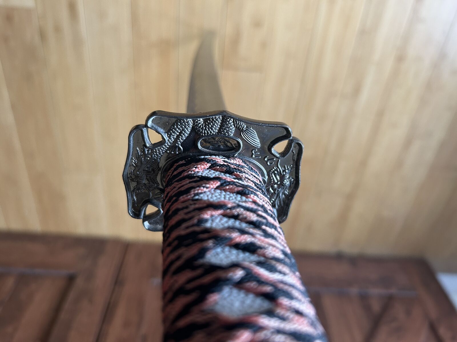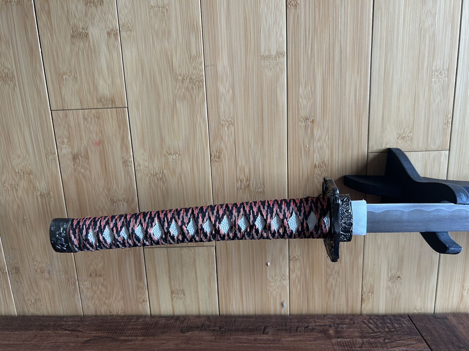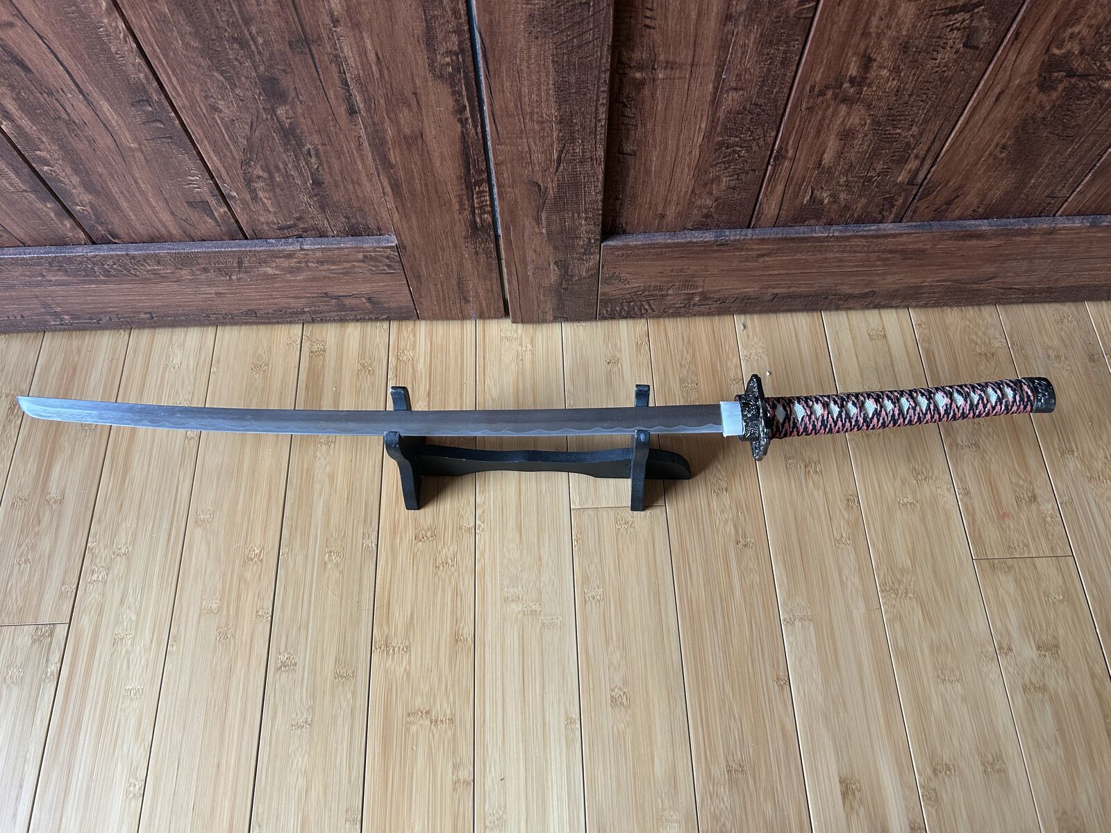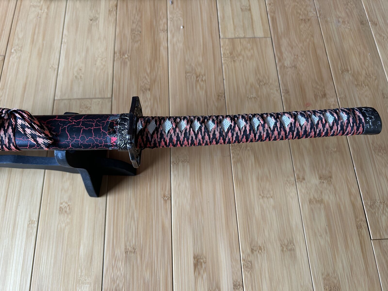 Decorative Japanese-style katana with striking red and black scabbard pattern and traditional wrapped handle. A bold display piece perfect for collectors, martial arts enthusiasts, or themed décor.