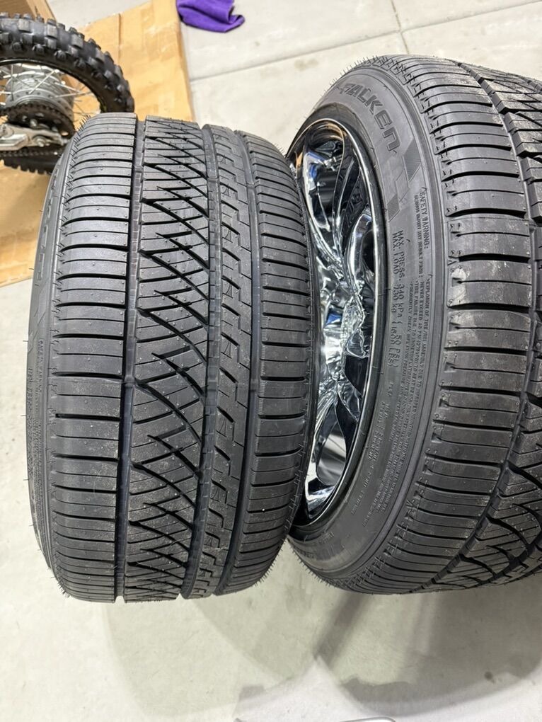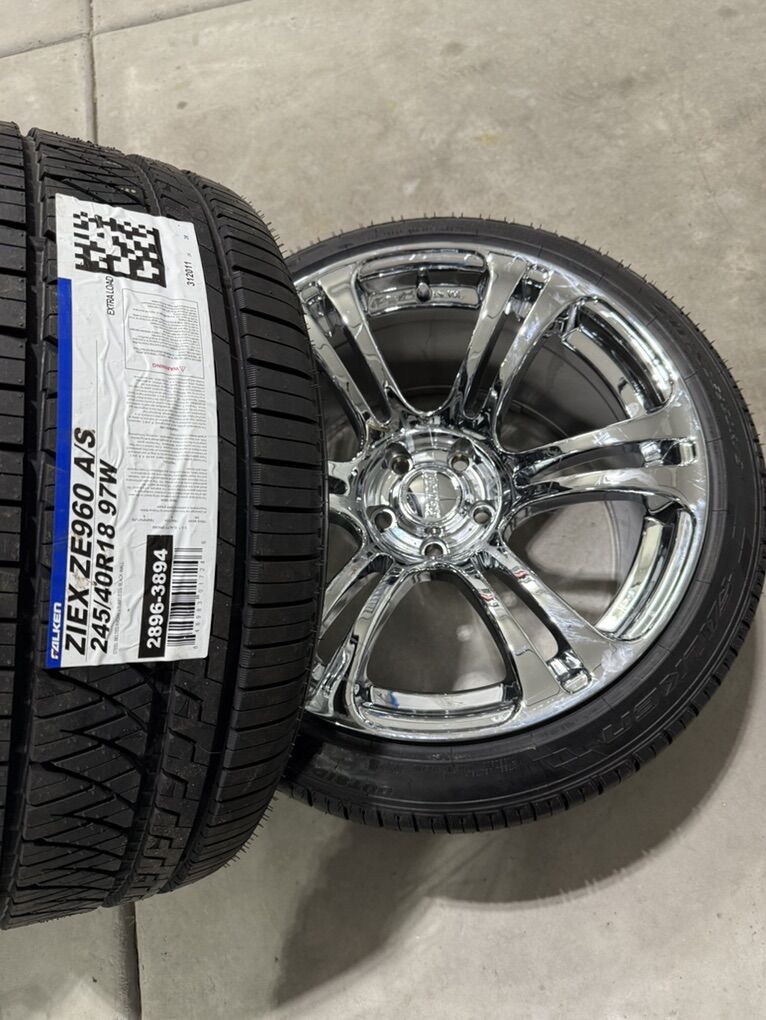 ApplePayBrand new 18x10.5 5/112 lug pattern +22 offset chrome Kansei wheels with 245 40r 18 Falken tires. Never ran just ordered the wrong size