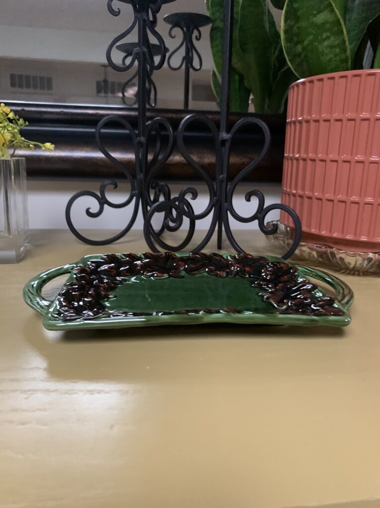 VenmoThis green and brown colored tray with an embossed border of leaves, will surely spruce up your table. 8”L x 6.5”W. Clean and ready to go. Non-smoking/No pet home.