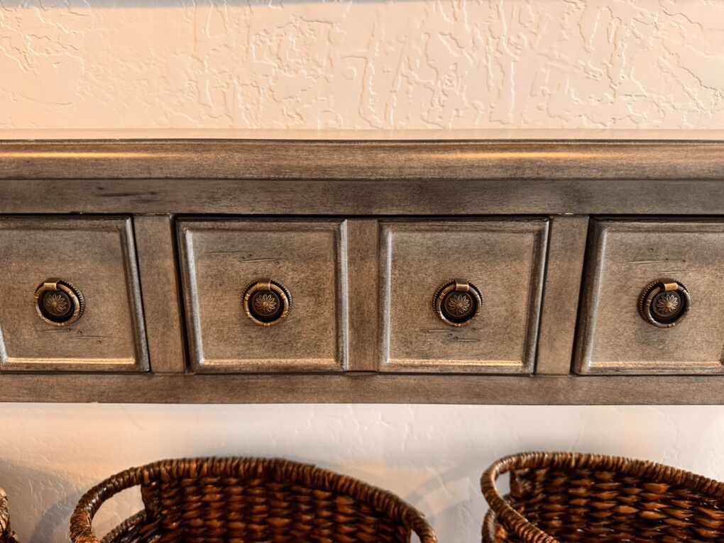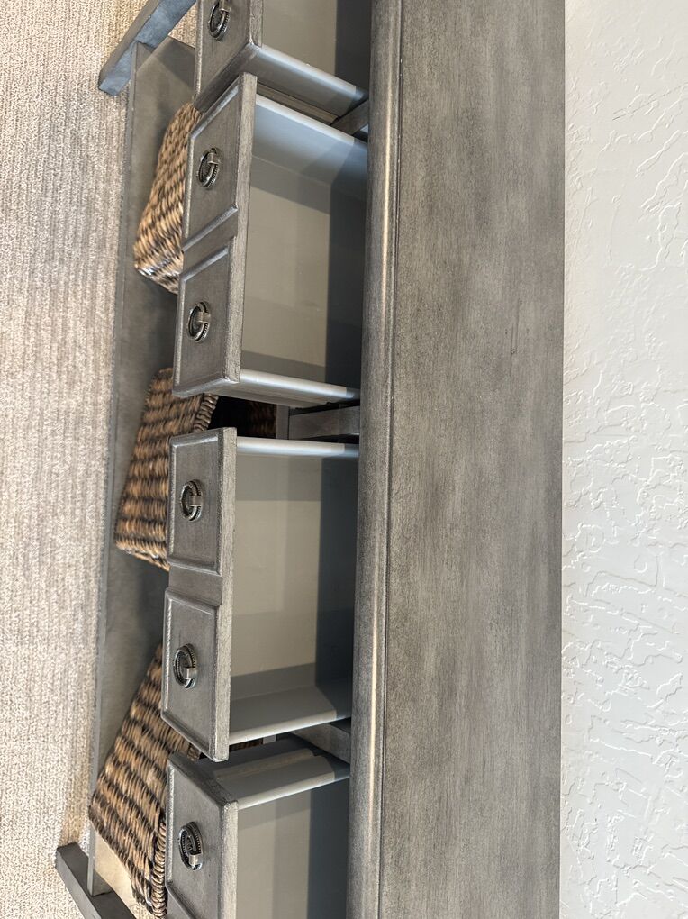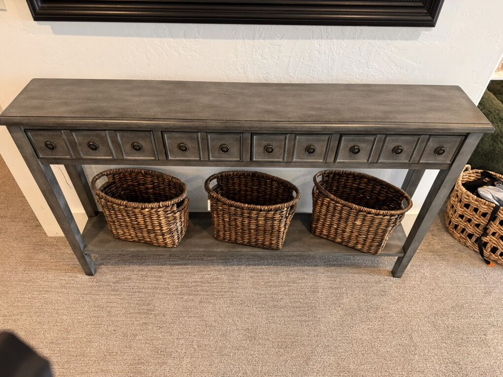 VenmoNarrow console table with 3 baskets included. Length- 60” Depth- 10” Height-34.5”