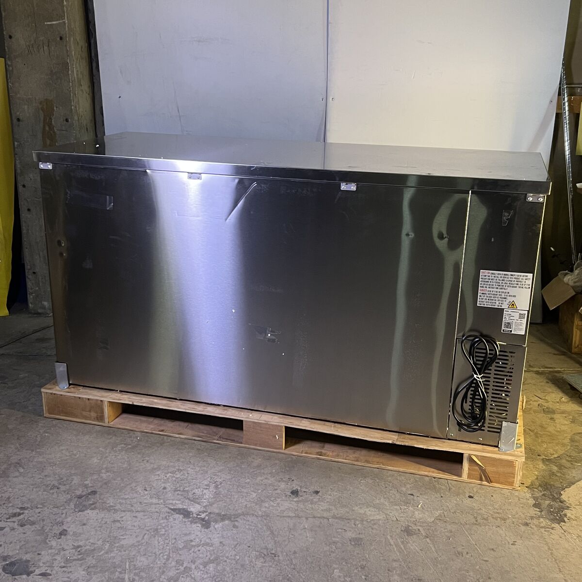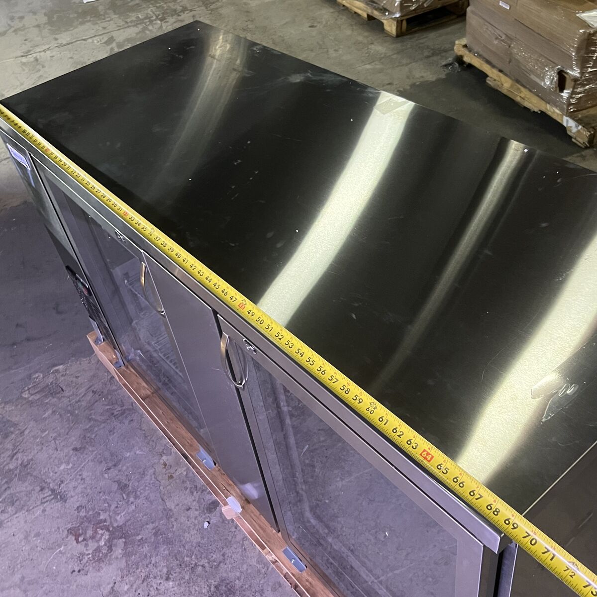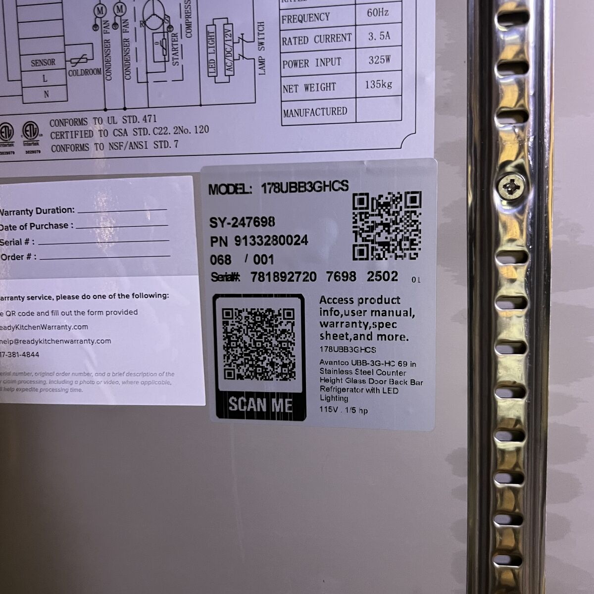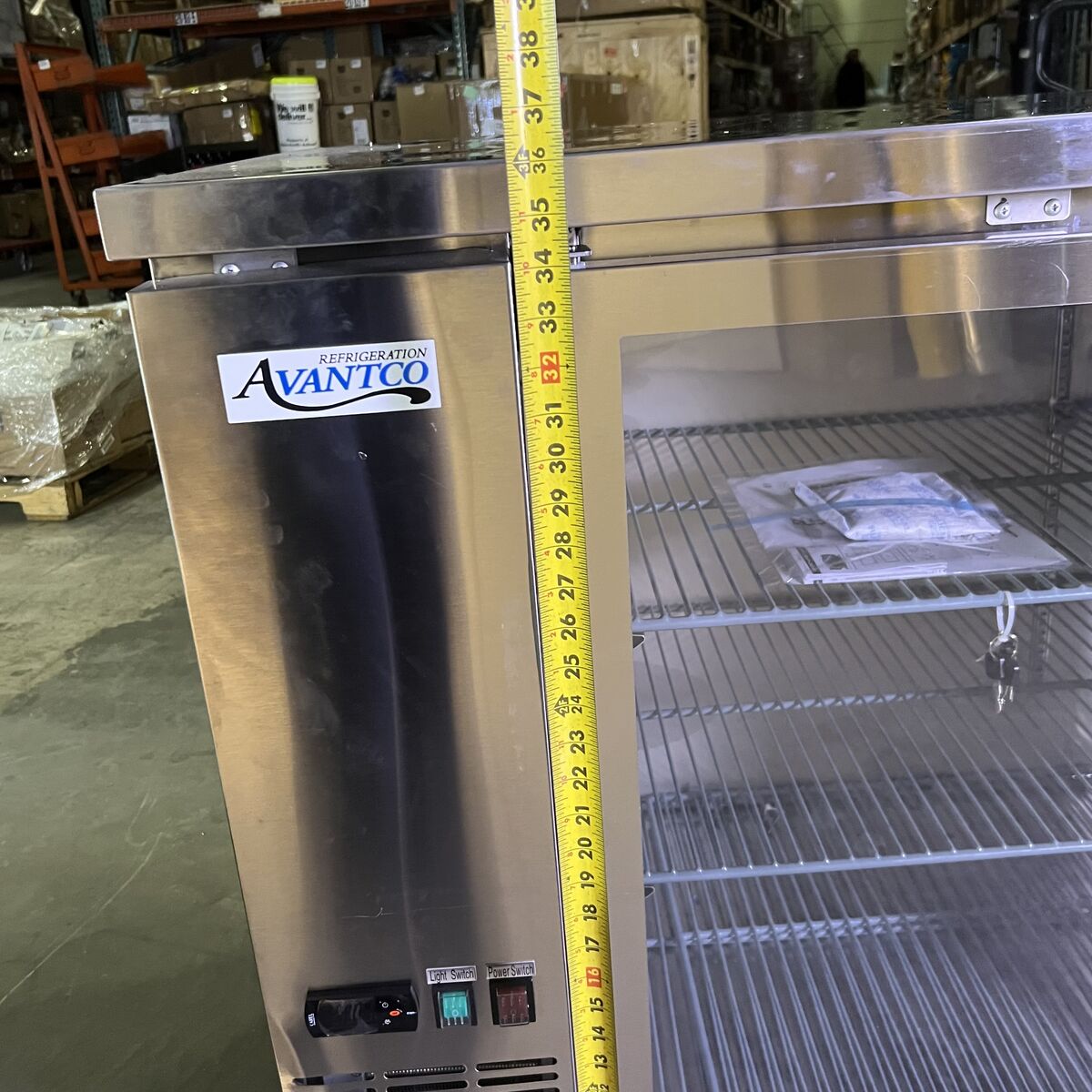 AVANTCO 69" Stainless Steel Counter Height Glass Door Back Bar Refrigerator with LED Lighting Condition: New Other, Minor Damage Cosmetic Size: 69"L x 28"W x 36"H Color: Steel MPN/Model: 178UBB3GHCS