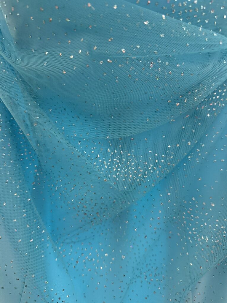 This turquoise blue evening dress features a strapless bodice and subtle sparkly details throughout the tulle fabric. Size 9/10 Only worn once and dry cleaned.