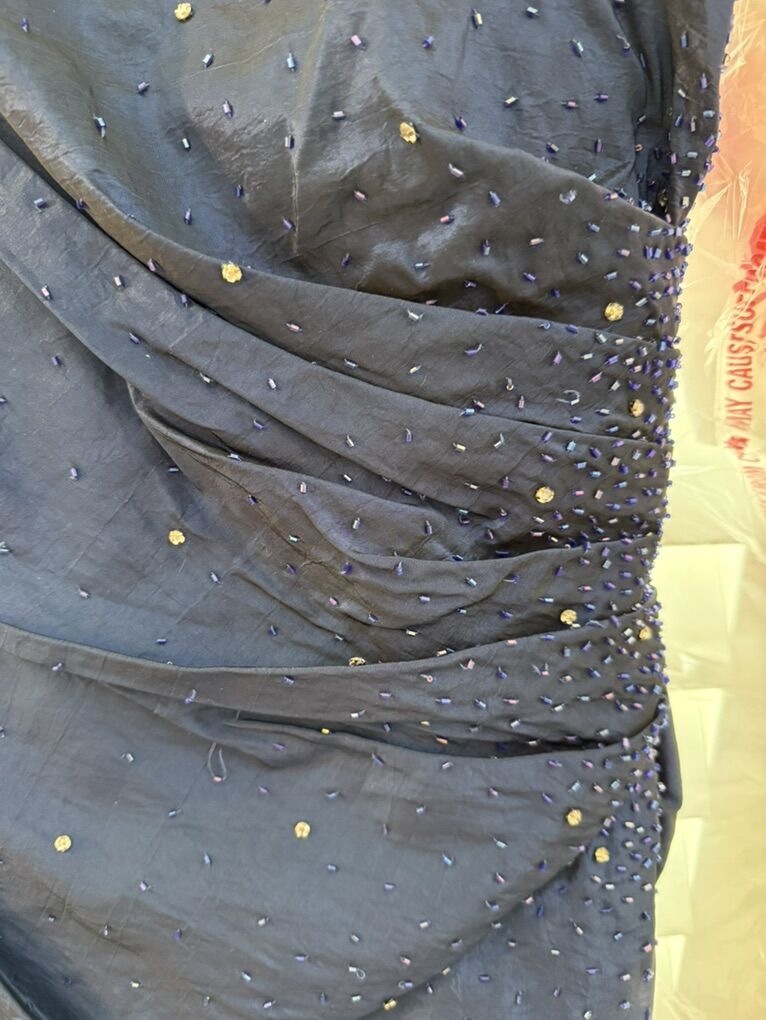 Navy blue strapless formal dress featuring sequined embellishments and a wrapped design. Size 13/14