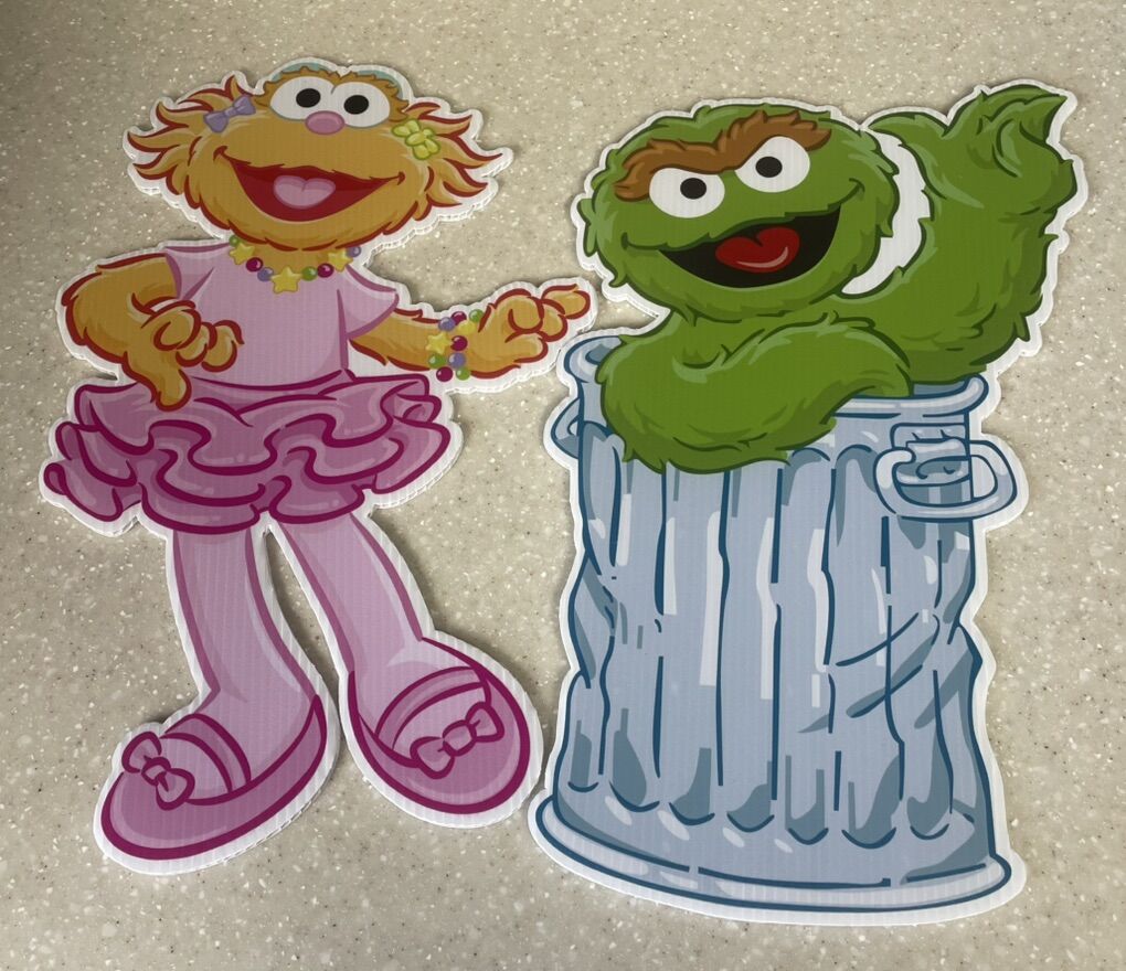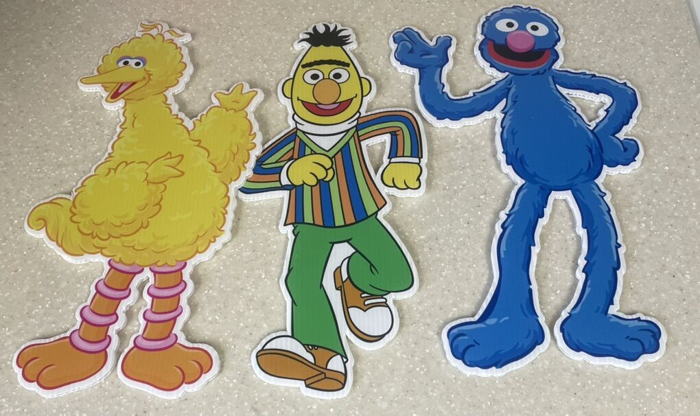 VenmoSesame Street character Cutouts. Each cutout is on plastic cardboard type material. So these can be used outside as well. Metal stakes so they can be put on the lawn as decorations Each character is separate, and 15 inches tall.