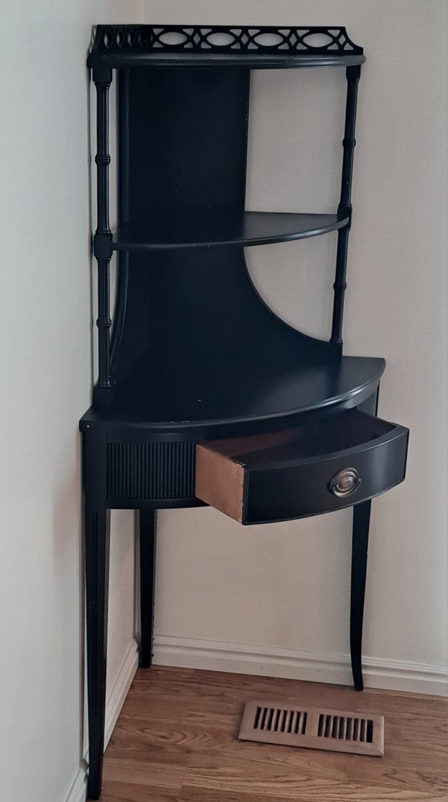 VenmoBlack corner shelf with one drawer. Corner shelf was painted black and has chipped in the back please see pictures. call or text 801-682-6860 will meet at Rusty Petals in Sunset or Clinton