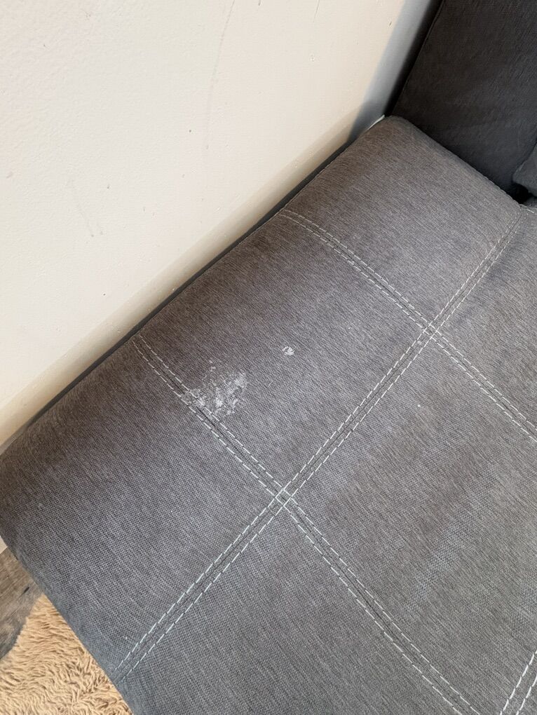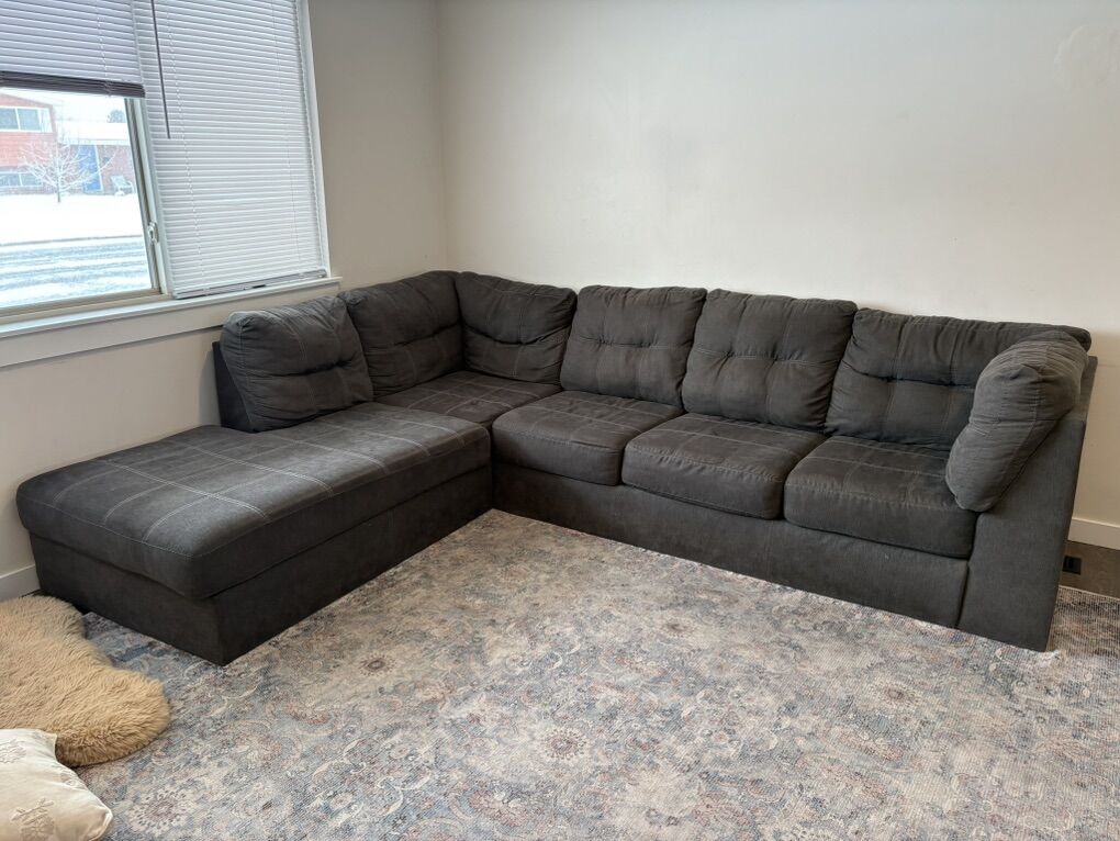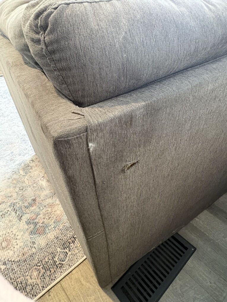 Comfy sectional. Used and in good condition. Rip on the back corner. A few small stains. Just cleaned it. Need this gone asap.