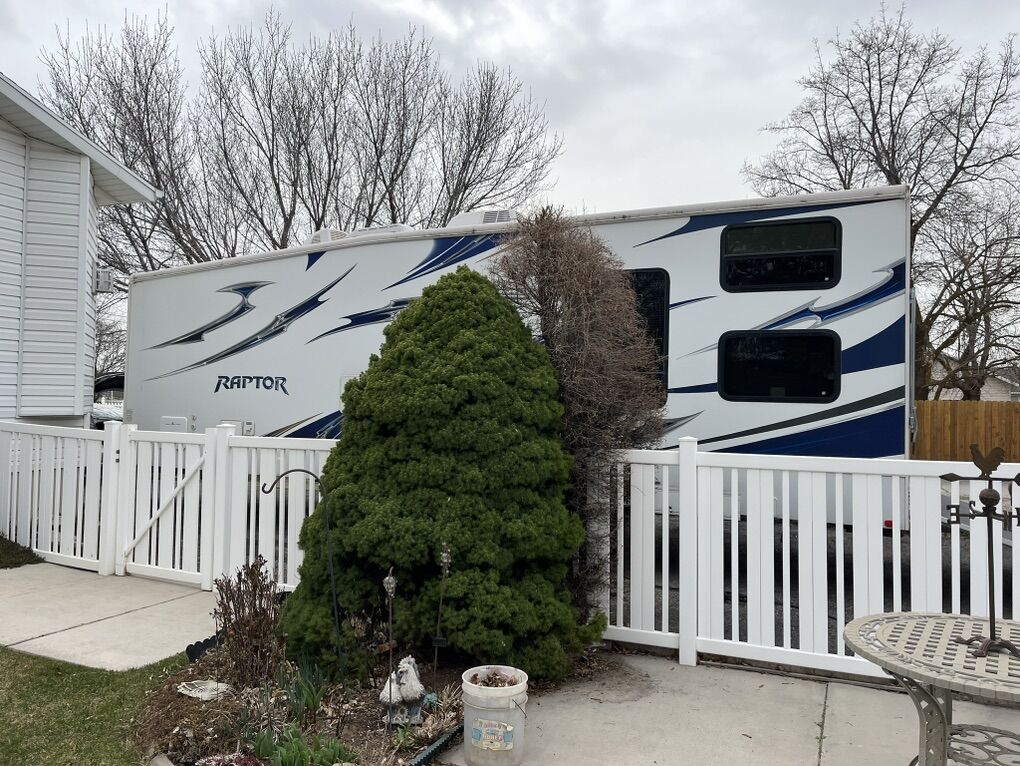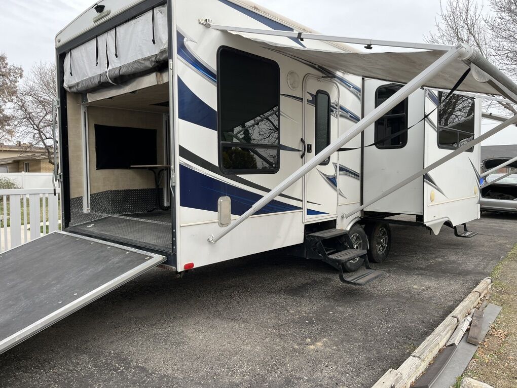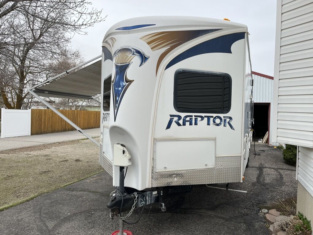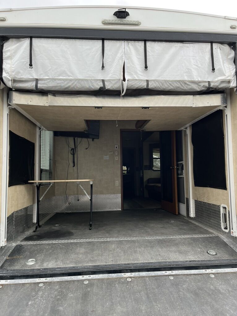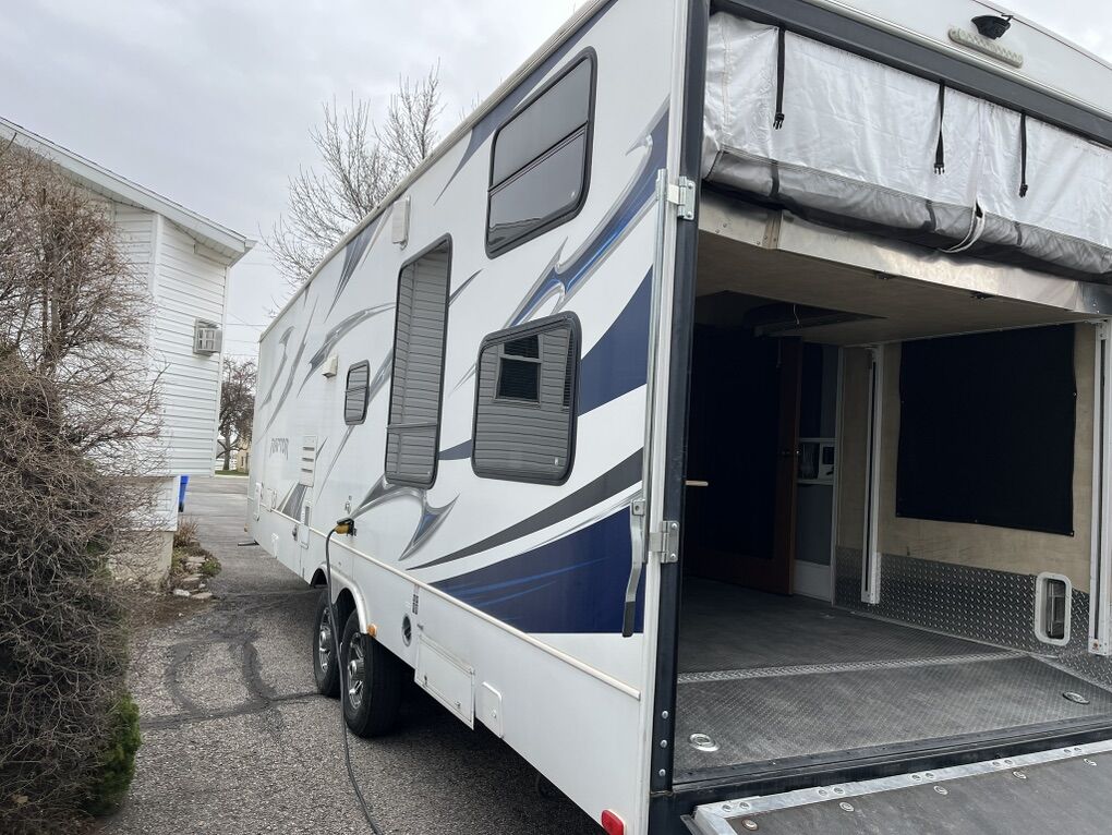 34ft 2012 Keystone RV Raptor Toy Hauler (M-30 FS-34) Garage is 10 ft long by 7.5 high. 75” under the bed when raised. It was used to haul a 2 seater Can am. Good condition all appliances/generator is working. It is located in Plain City.