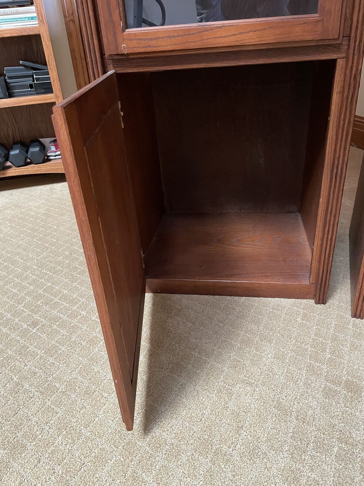 Two cabinets with overhead crown molding section to combine for TV center. Each side has adjustable shelf’s