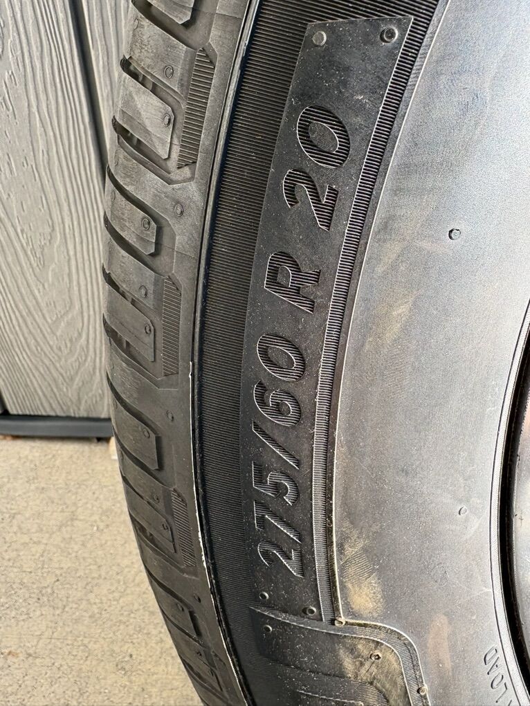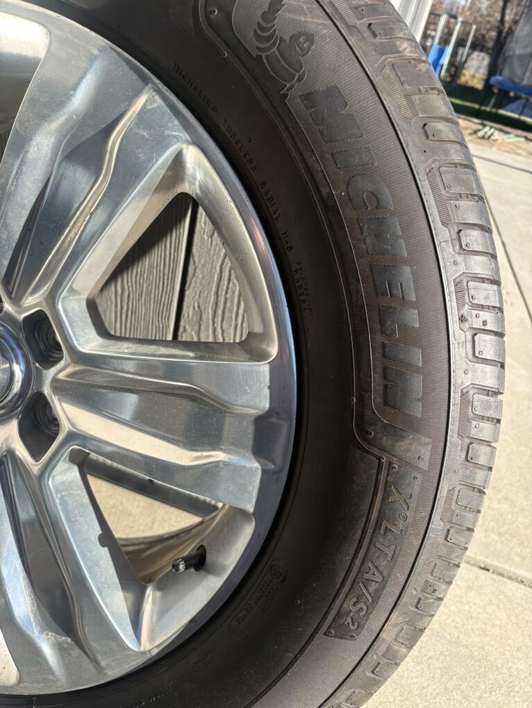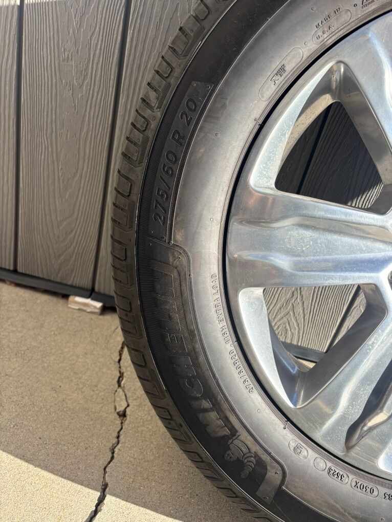 The tires have less than 5,000 miles on them and look perfect. They are Michelin X LT A/S2 (all season) and are XL (extra load) rated. Size is 275 / 60 R 20. Diameter is right at 33”.