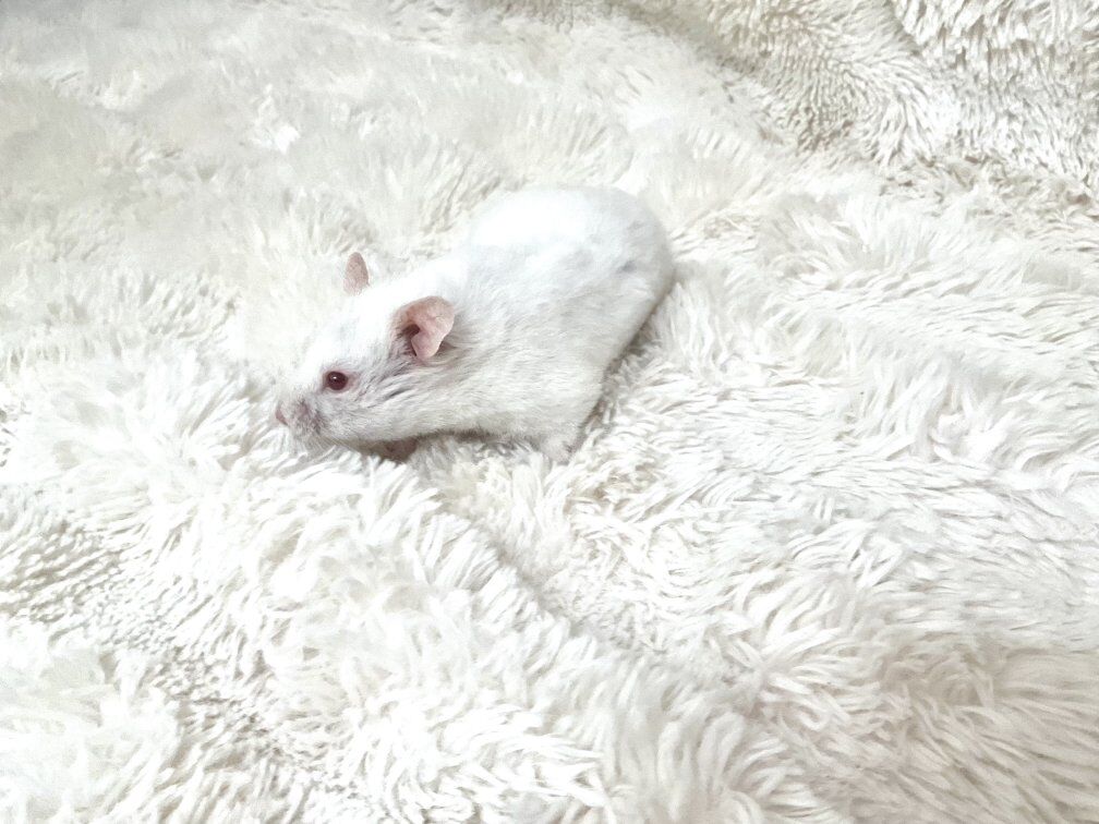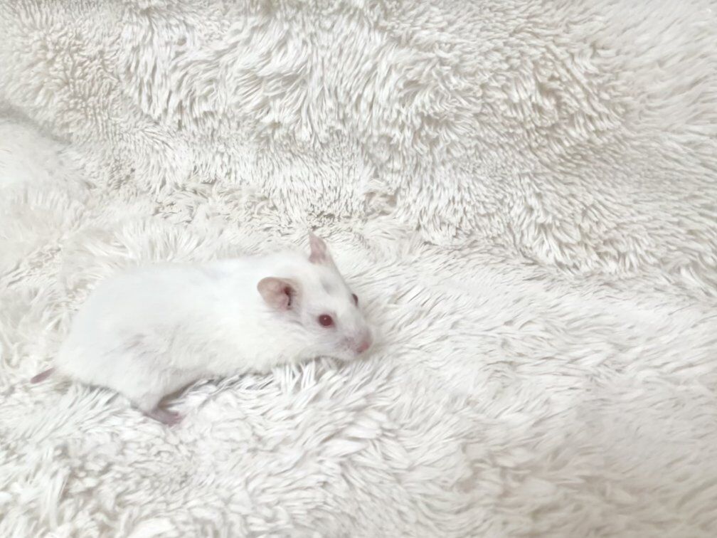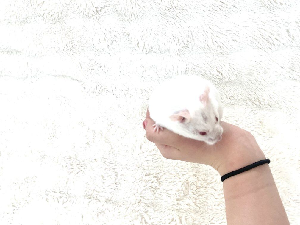 Hi my name is Sprinkles! I am a female white Teddy Bear hamster. My owners bought me a year ago. I am super sweet and gentle. I have never bit anyone, I am very good with new people and little kids. I have never had a litter, although I am not fixed.