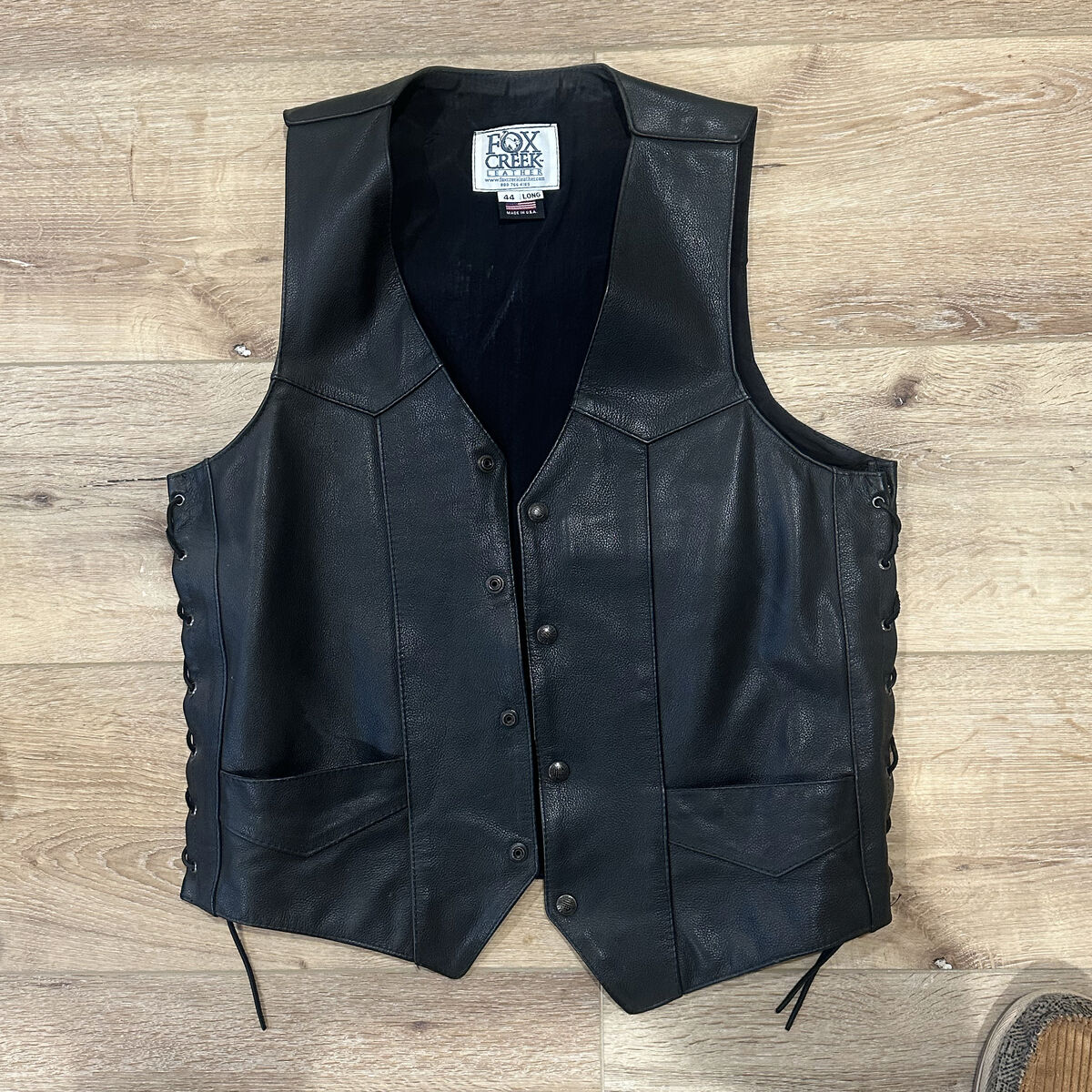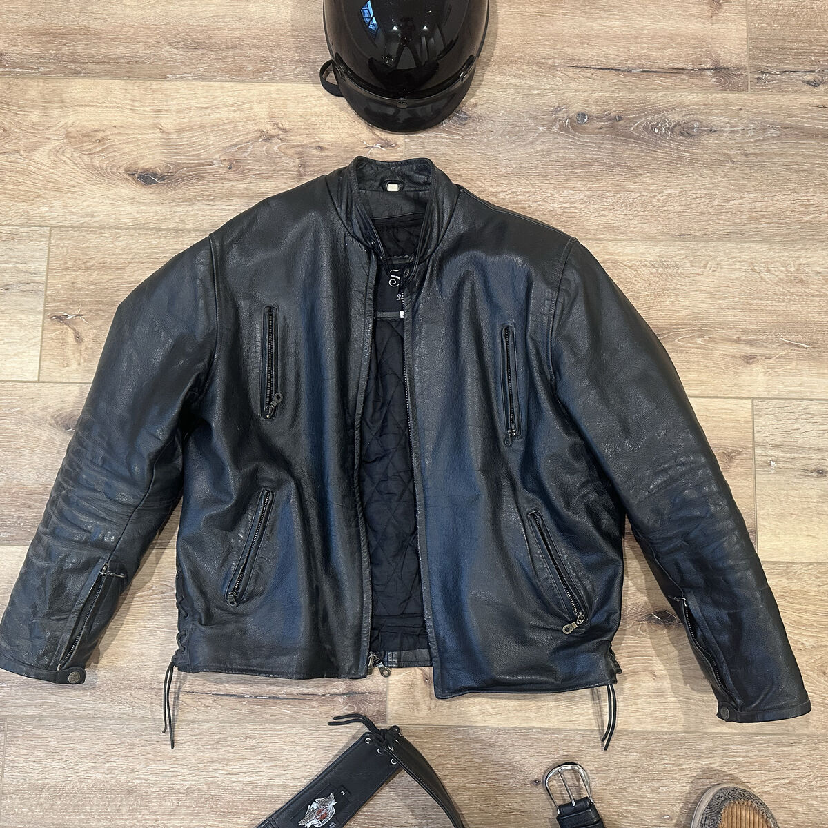 ZelleHigh quality full men’s motorcycle riding kit. DOT approved 1/2 Helmet w/removable ear flaps - size large Leather Jacket - zip in liner, incorporated armor in elbows, back, and shoulders. Size - XL Leather Vest - Fox Creek Leather vest - size 44” long Leather Chaps - Harley Davidson - size Medium