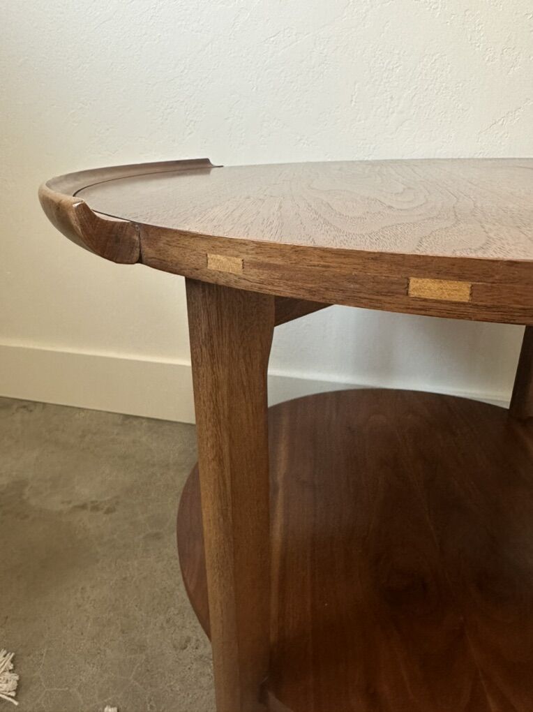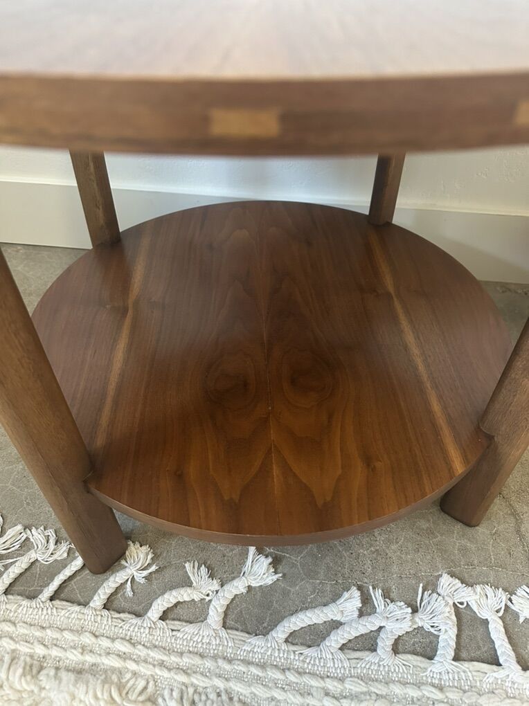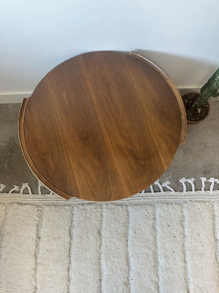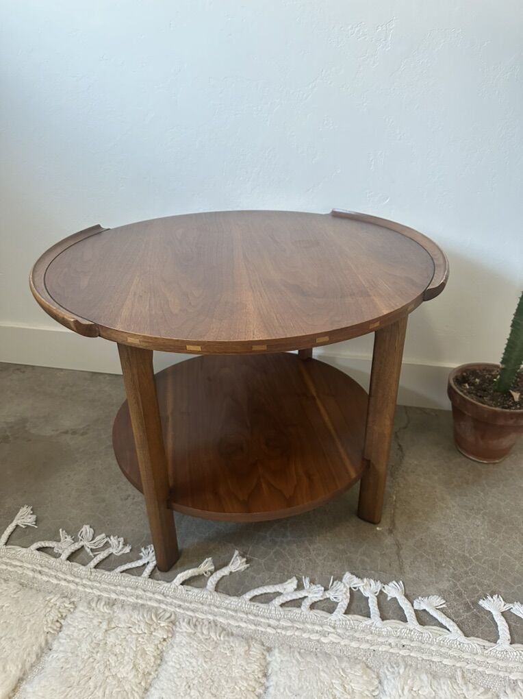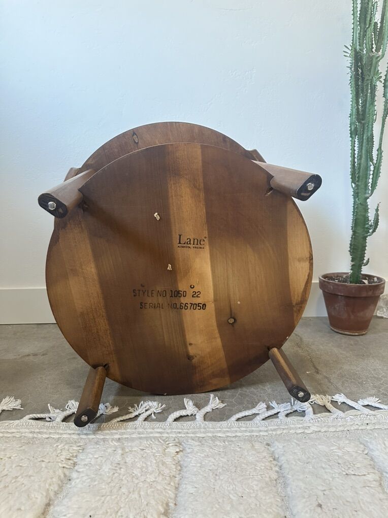 VenmoVintage Lane Altavista, Virginia Vogue style no. 1050 22. A Mid Century era round two-tier aide table. Typically walnut, ash with dish top edges. Dimensions: 26 diameter, 28 in width, 20.5 in height, with a 22 shelf diameter. Has slight water marks that could very well be buffed out.
