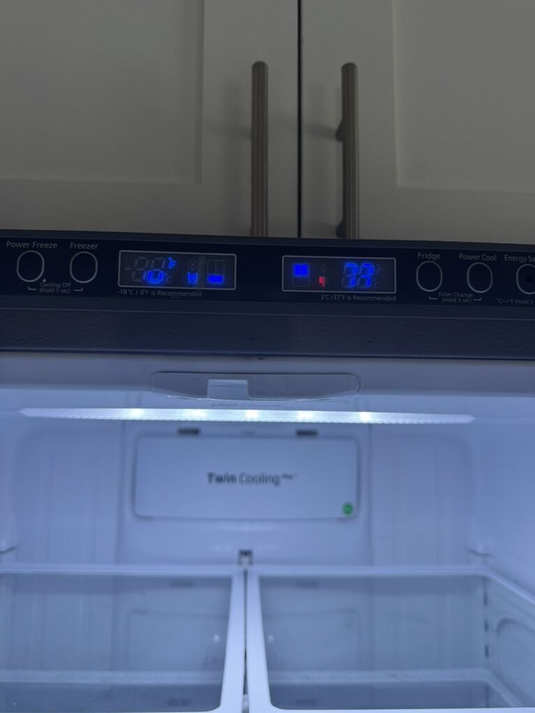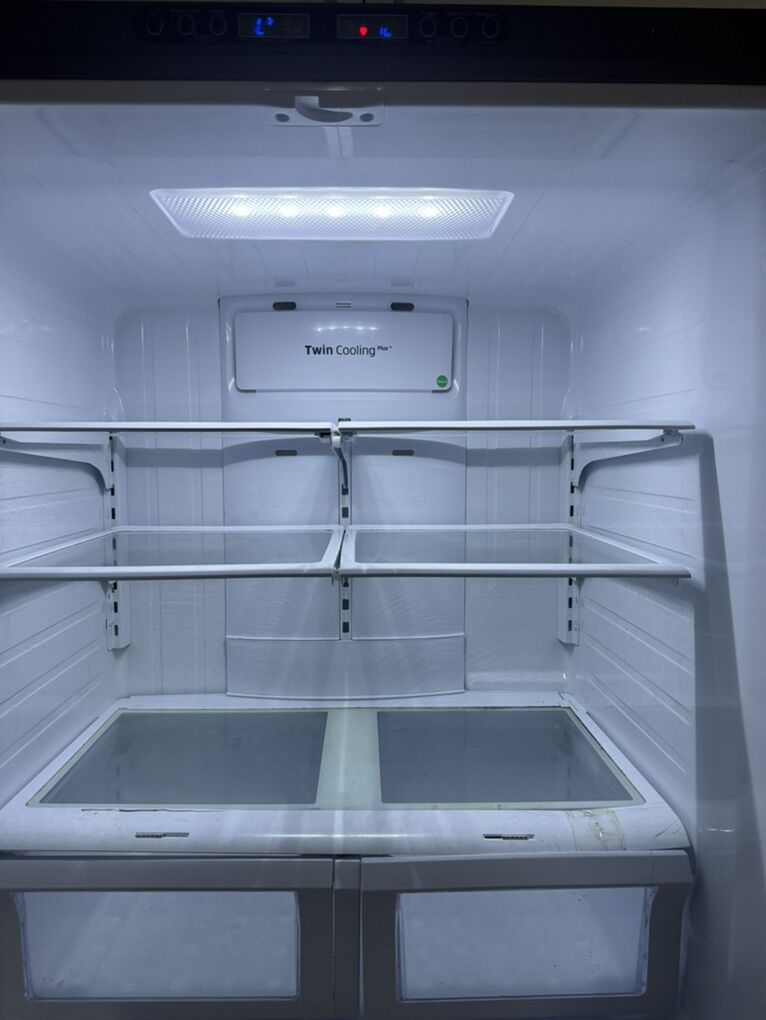Samsung fridge 29 cubic in. Works great has a cracked bottom shelf in the plastic part and the fridge has a drip leak from the back panel. But still works great and the freezer does too! Asking for $75 OBO