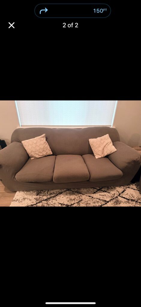 ZelleSerious buyers only please!! Couch in the picture shows that there’s no cover. The loveseat is the one that has the cover on it all the pillows and cushions and ottoman have the covers to go with it. $150 for the couch set with the pillow cushion and ottoman covers, no cats, no rips