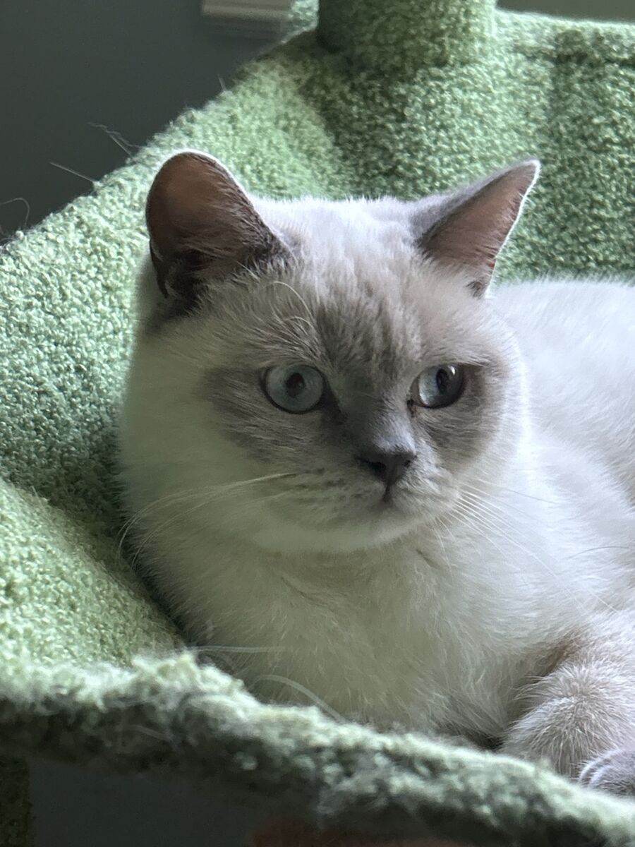 Finnick is a sweet Blue Point Scottish Shorthair. He is a loving little guy who will fall at your feet for pets and softly meows for his dinner. Finnick enjoys his space but will happily nap near you. He may want to hide at first, but once he warms up to you, you will have a friend for life. He is healthy, robust, and likes to lick his platter clean. Finny loves to play and chase after feathery toys. Finny has a calm sweet nature.