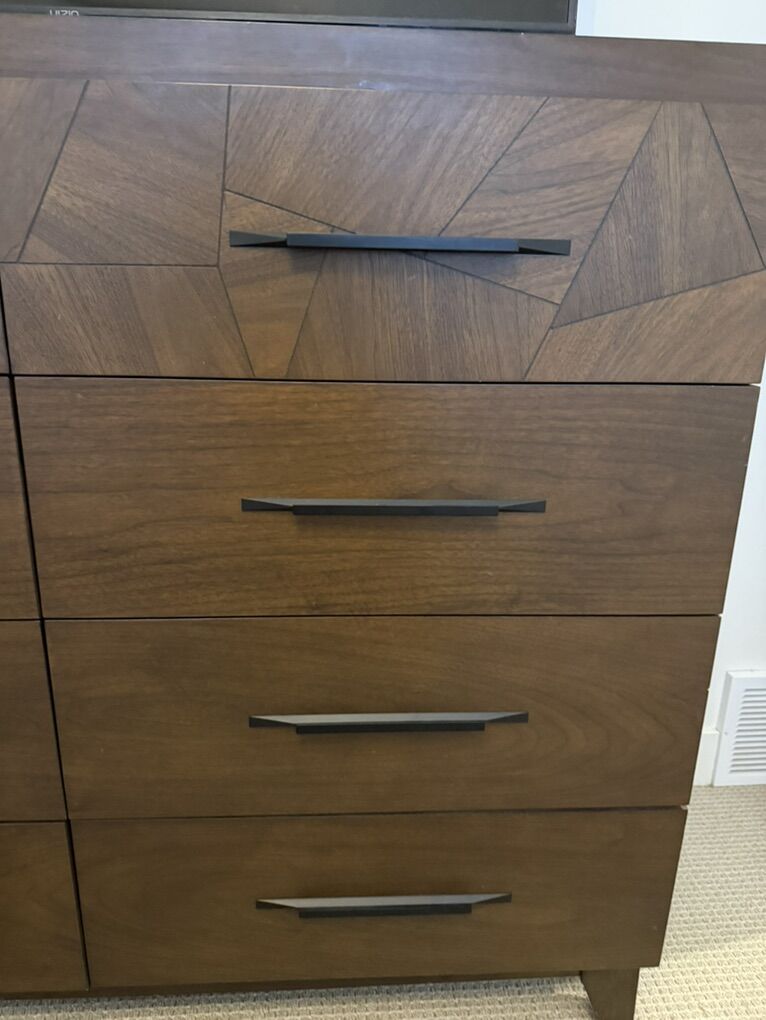 VenmoThis dresser is beautiful with dark wood and the cutest modern details. 8 drawers. Solid and sturdy (comes with secure wall mount) 18” deep 55” wide 46” tall