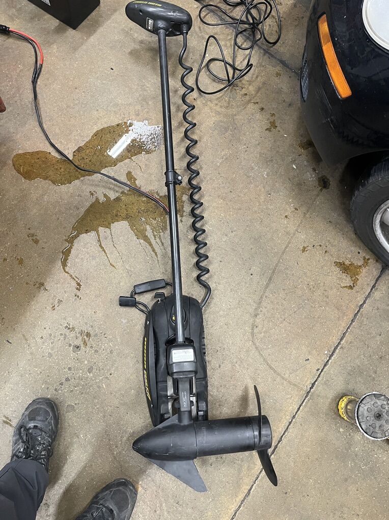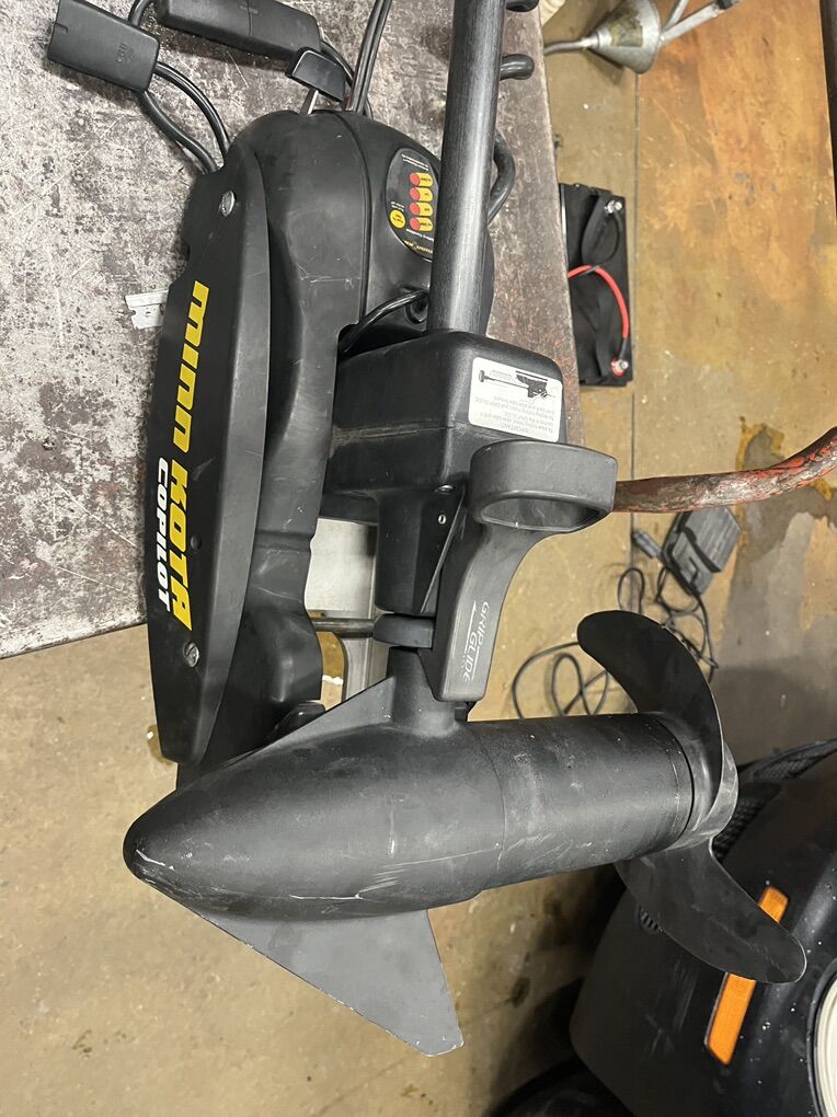 Zelle65 pound thrust with the copilot installed and comes with the remote. This is a 24 V trolling motor. I will include the 50 amp power 24 V battery that weighs 23 pounds. This trolling motor works great. I just replaced the brushes in the motor no problems at all with it. You can use the remote or the foot control for adjusting, thrust and steering. If the ad is up, it is still available.