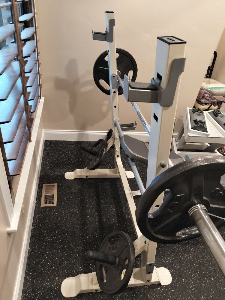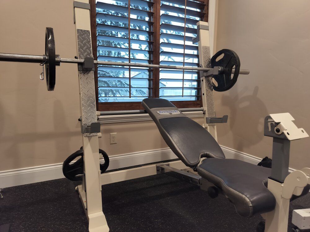 ZelleIGS weight bench in great shape! It has adjustable incline, and one decline position. With weight holders, and squat rack on the back. Comes with the Olympic bar, and a set of 35lb, and set of 45lbs plates with keepers.