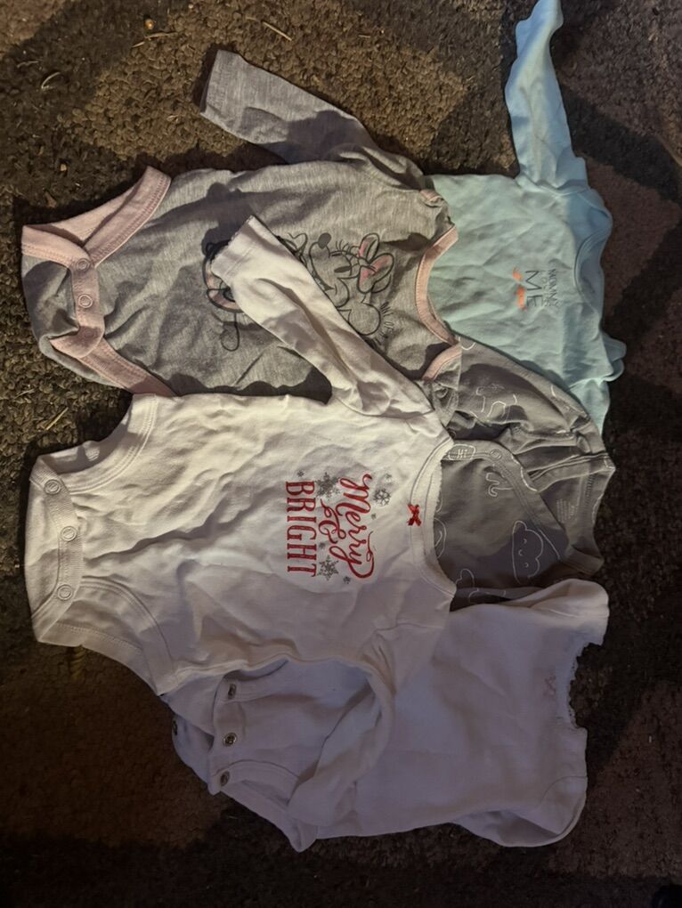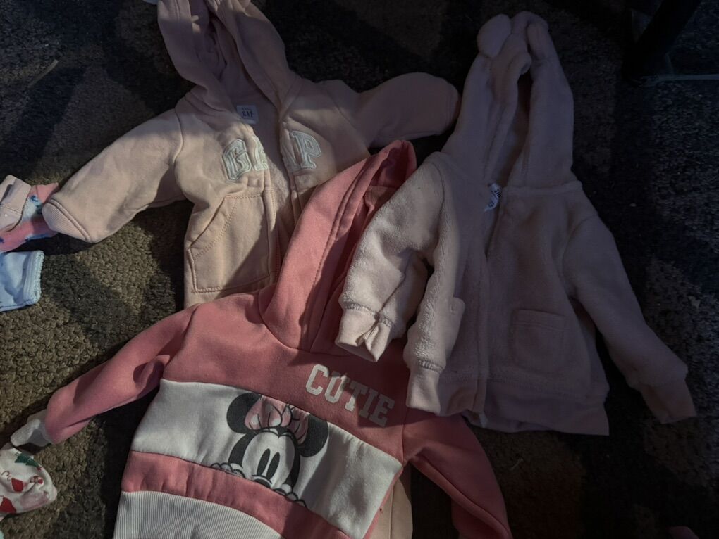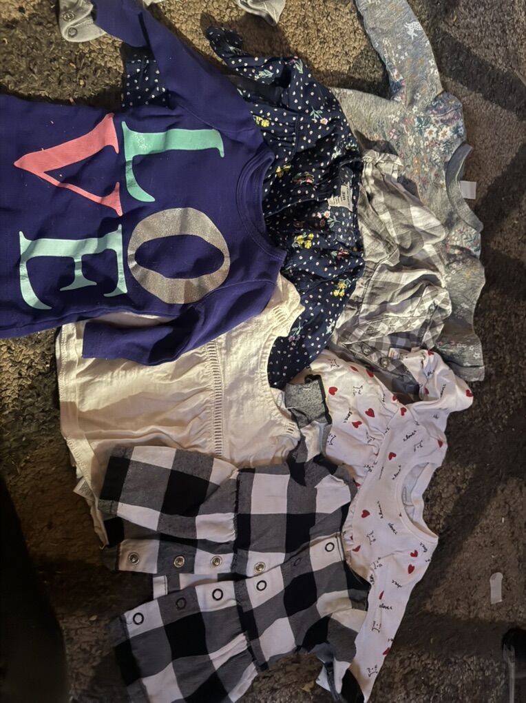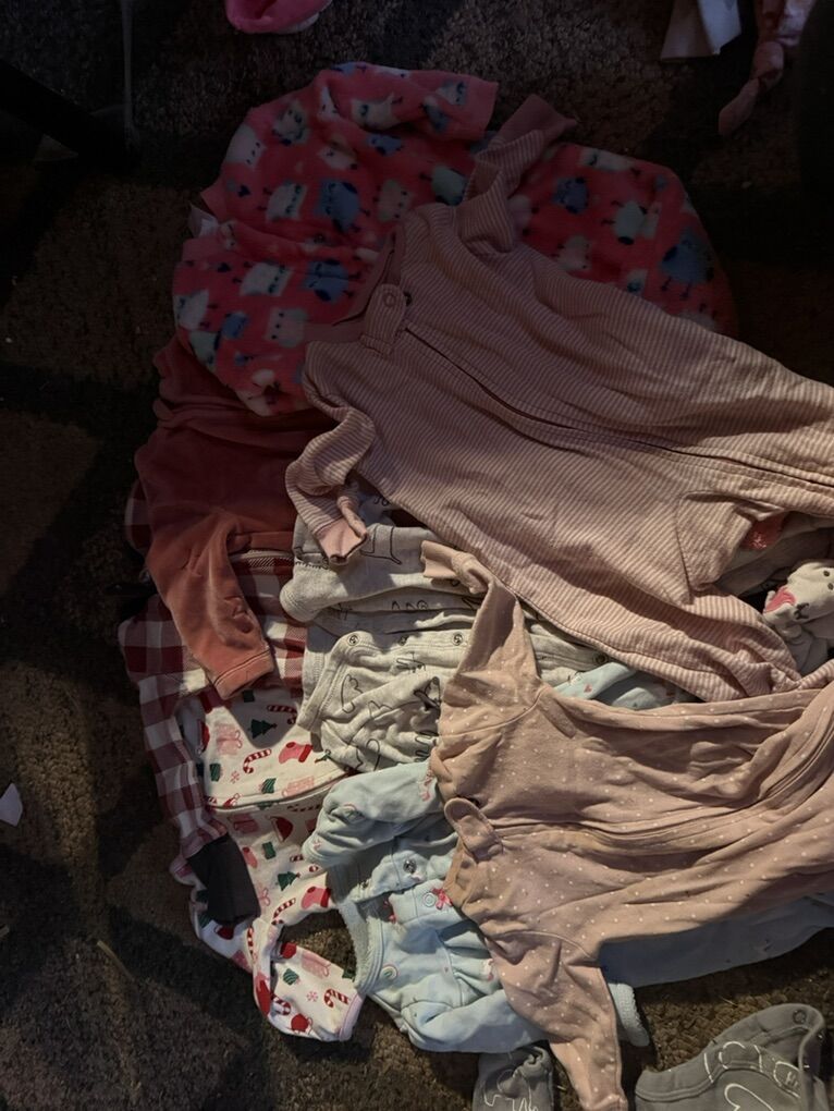 Some new or lightly used and a few with little stains. 40 obo 5 pants 2 jacket 1 full body 2 short sleeve shirts/dresses 7 long sleeve shirts/dresses 8 sleepers 5 long sleeve onesies 13 short sleeve onesies