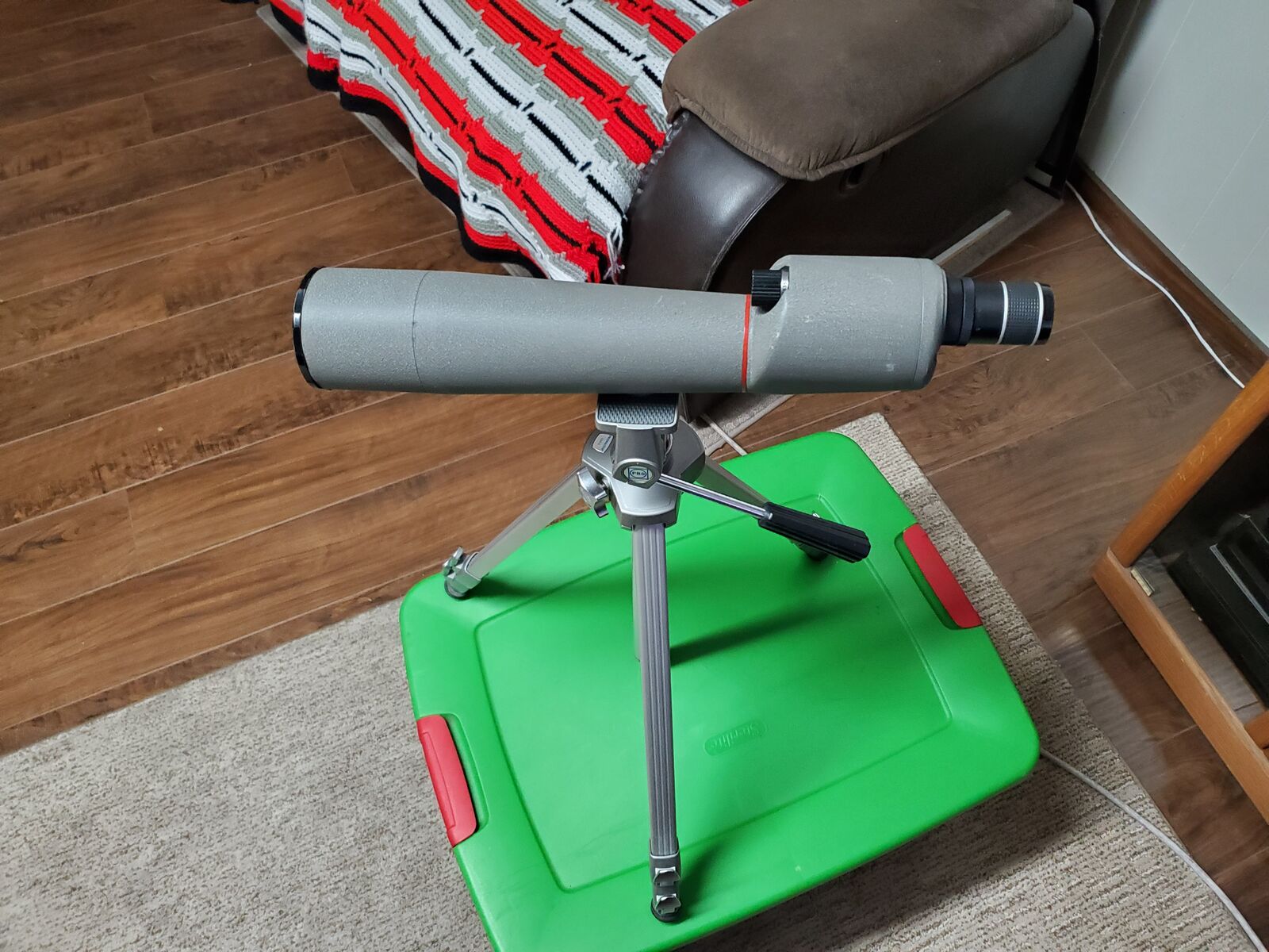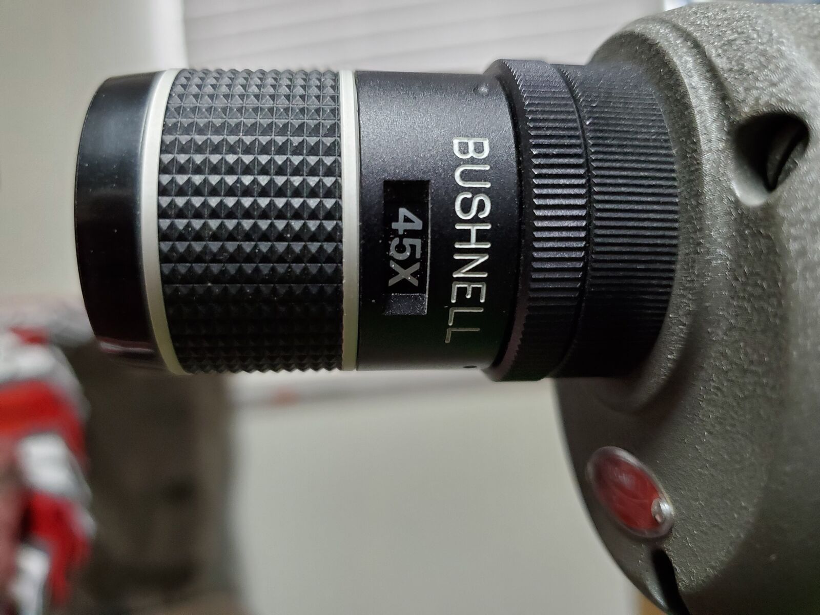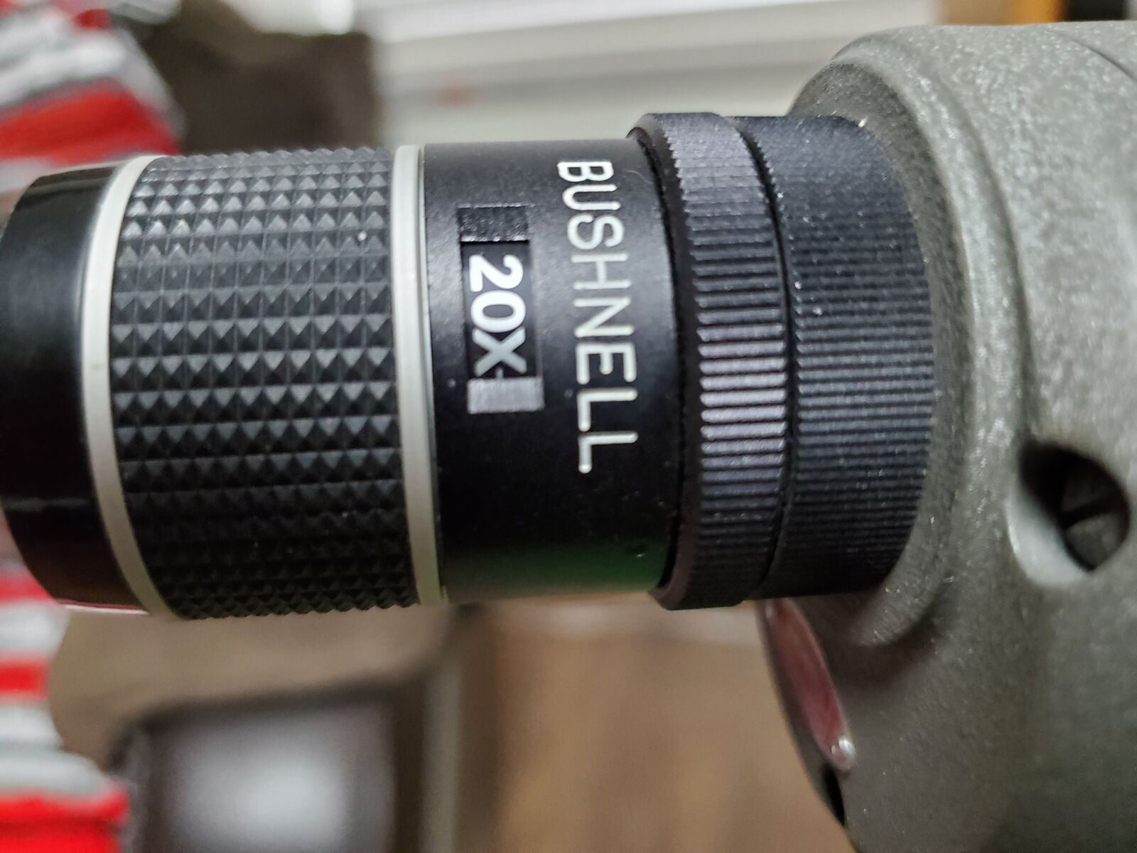 Bushnell 20x to 45x power spotting scope with tripod. It is a very nice scope to sight in your hunting rifle or to look for deer in the wild.