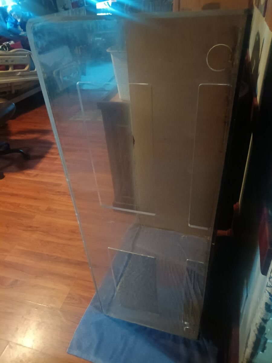500 for the aquarium. 100 for the stand. 90 gallon acrylic with curved corners. It’s 48 inches long. 18 inches deep. 24 inches tall. The stand is made of mahogany and is deeper than the aquarium for supplies. Minor repair work with the top left molding of the stand needed.