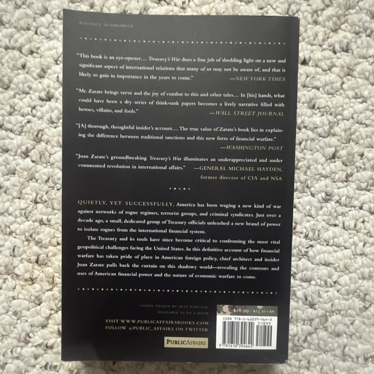 "Treasury's War" by Juan C. Zarate is a trade paperback book published by PublicAffairs in 2013. This nonfiction book is intended for young adults and adults interested in finance and politics. The author's insights on the intersection of finance and international relations make it a valuable read for those looking to understand global economic strategies and policymaking. With a focus on the 2010s era, this book offers a comprehensive look at the complex relationships between governments and financial institutions.