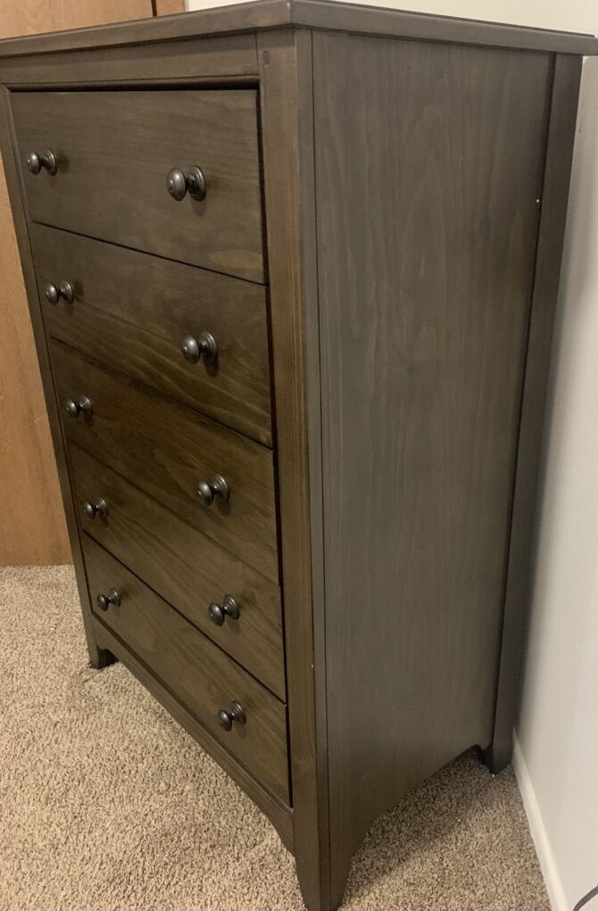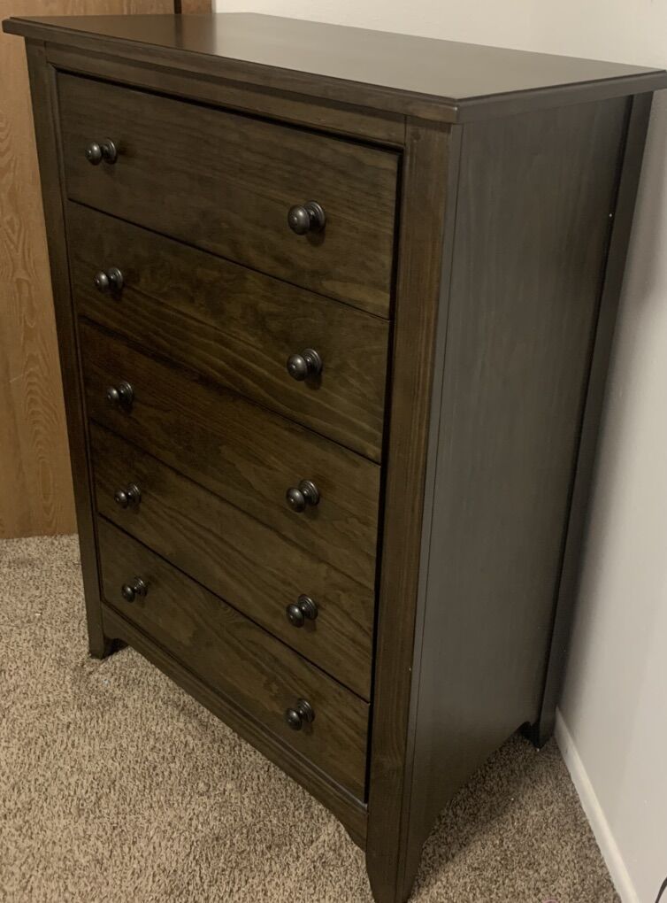 VenmoBrand new in the box beautiful 5 drawer dresser One left High quality Nice sliding drawers Measurements- 49in tall 34in wide 18in depth Can deliver Pictures are of the model. The one left is brand new in box