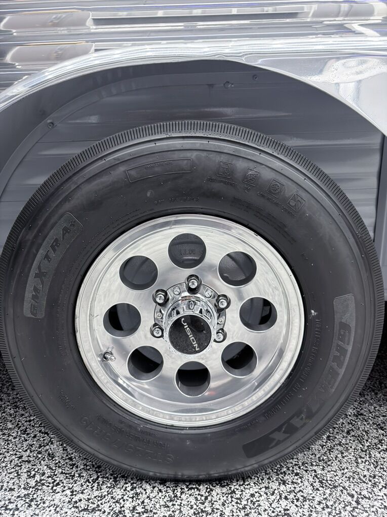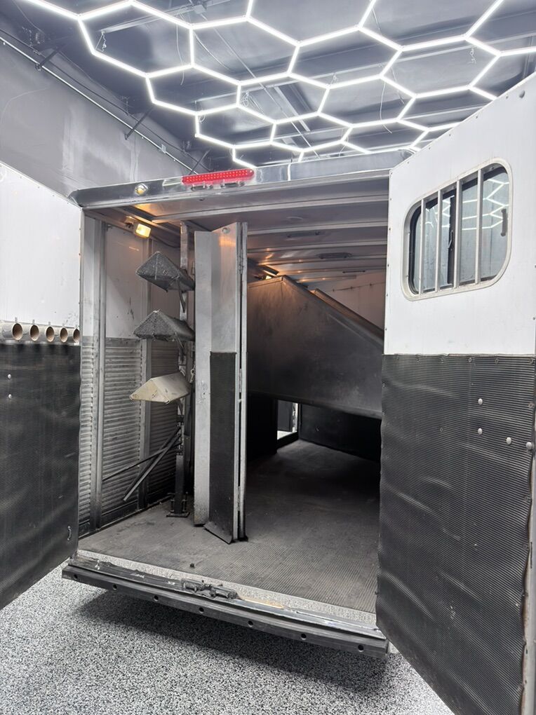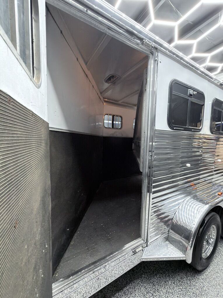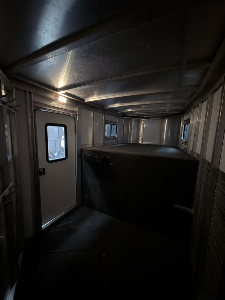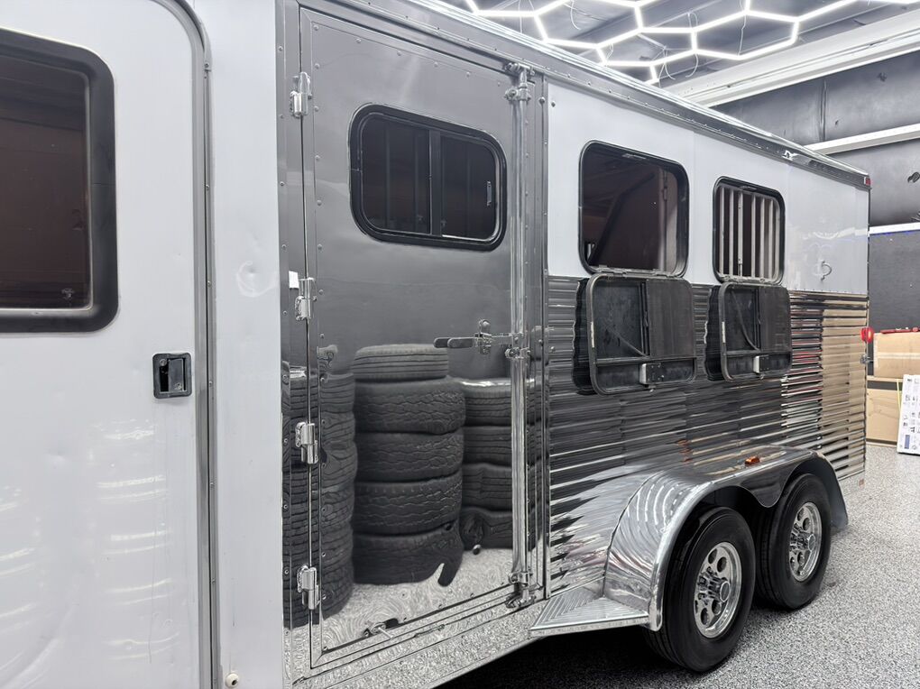 • 3-Horse gooseneck • Collapsible rear tack • Dressing room • All-aluminum construction (skin, frame, roof & floor) • 6’10” wide × 18’ box × 7’ tall • Drop-down windows on head wall (2) + bus window on escape door • Dual 4,880 lb rubber torsion axles • Electric brakes on both axles • Floor lined with mats • 6-lug 15” polished aluminum wheels • Brand-new 14-ply tires (ST225/75R15) • All the lights work as they should