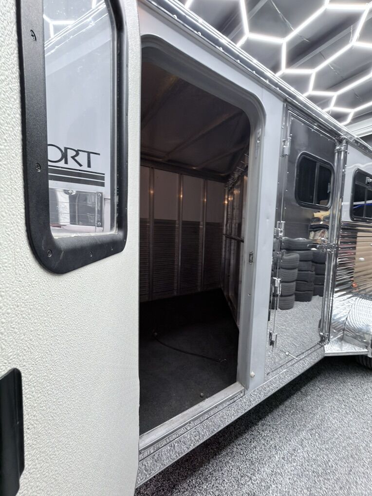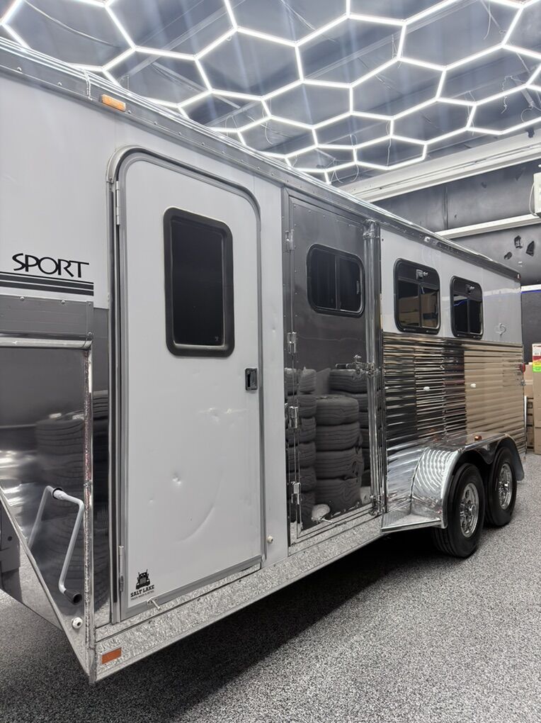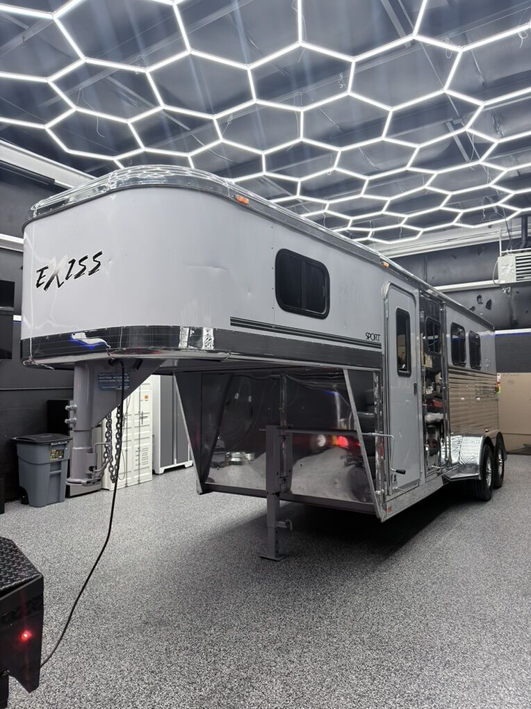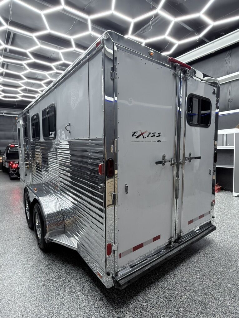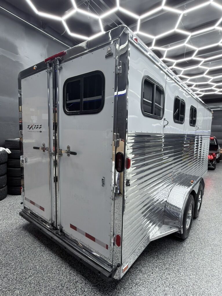 • 3-Horse gooseneck • Collapsible rear tack • Dressing room • All-aluminum construction (skin, frame, roof & floor) • 6’10” wide × 18’ box × 7’ tall • Drop-down windows on head wall (2) + bus window on escape door • Dual 4,880 lb rubber torsion axles • Electric brakes on both axles • Floor lined with mats • 6-lug 15” polished aluminum wheels • Brand-new 14-ply tires (ST225/75R15) • All the lights work as they should