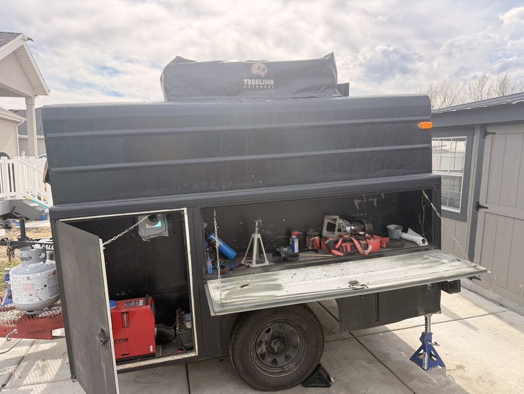 • Heavy-duty steel service bed construction • Rooftop tent mounted and ready for adventure • Tons of lockable storage compartments for gear, tools, recovery equipment, etc. • Interior sleeping platform built inside trailer for cold weather or stealth camping • Diesel heater INCLUDED • Battery INCLUDED to power heater and accessories • Rear work platform and gear mounting • Roof rack and additional storage options • Extremely rugged and stable design • Off-grid ready