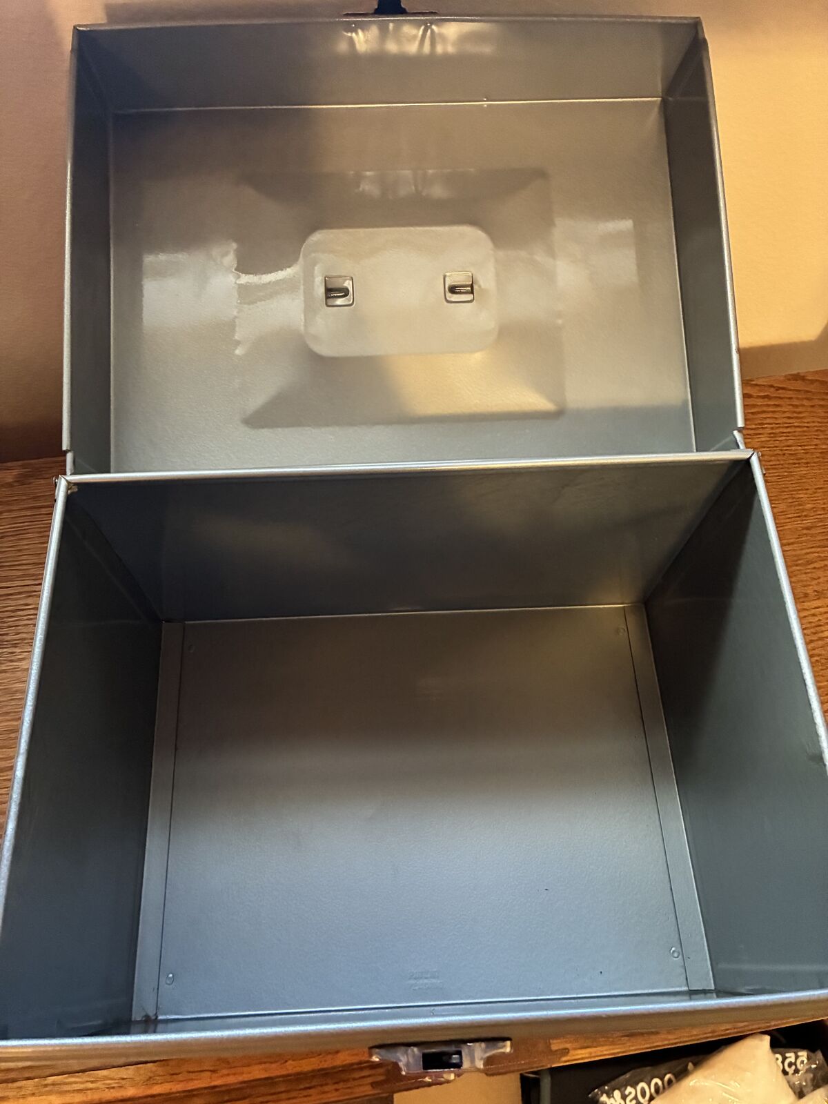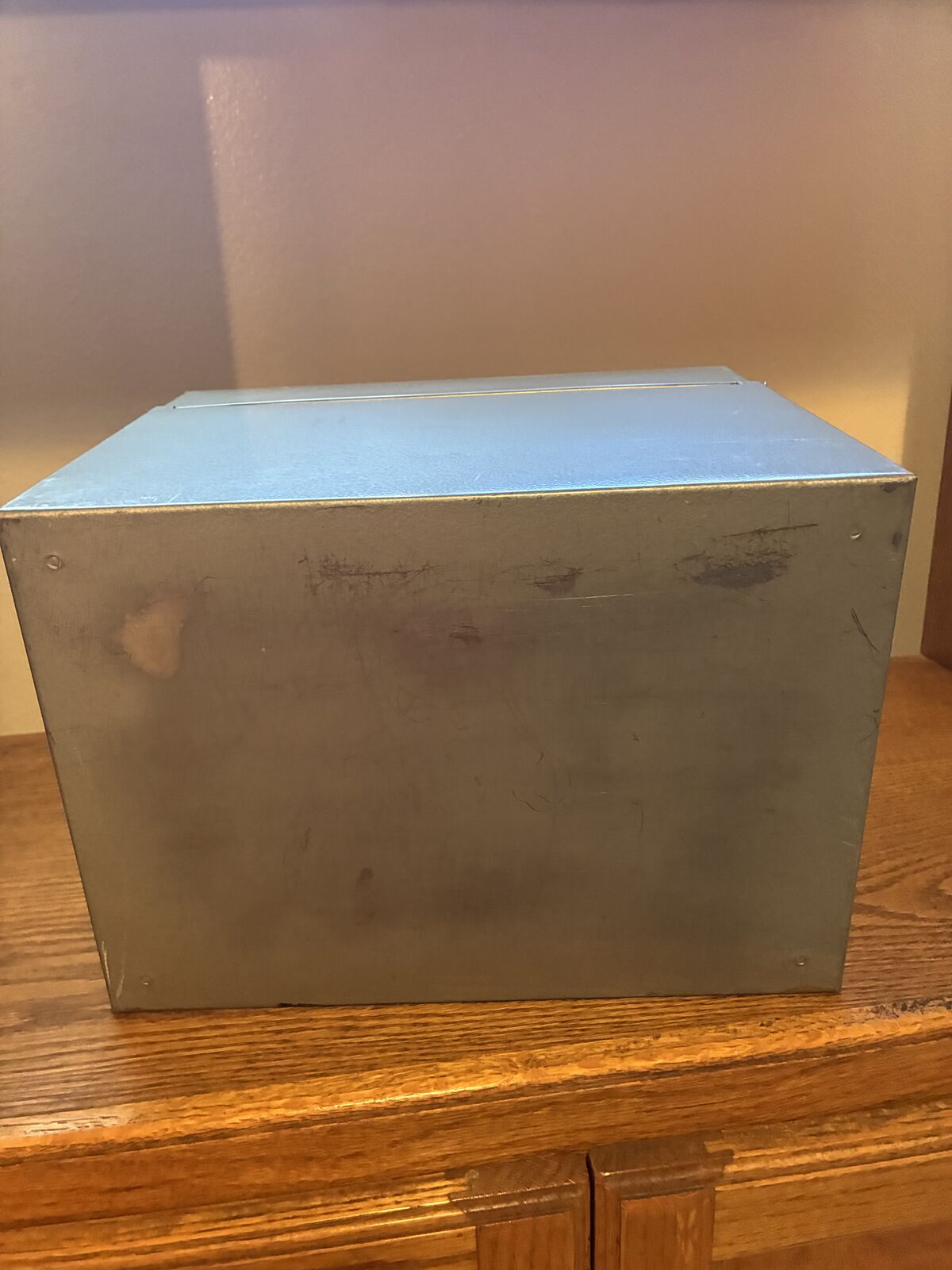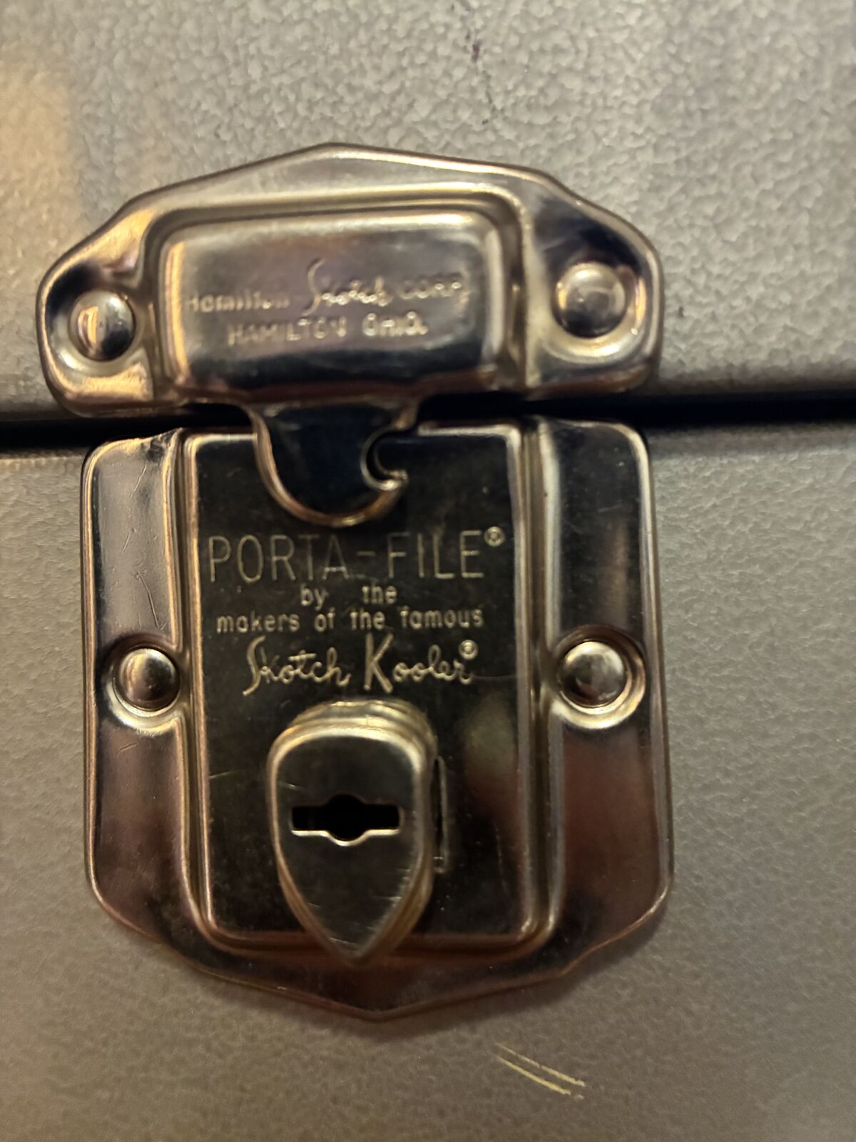 Venmo1960’s Porta-File lock box “makers of the famous Scotch Kooler”. No handle, no key but a key is not required to close and open. If you push the key hold down it releases the lock. Good condition some rusting/wear and and minor dents on top.
