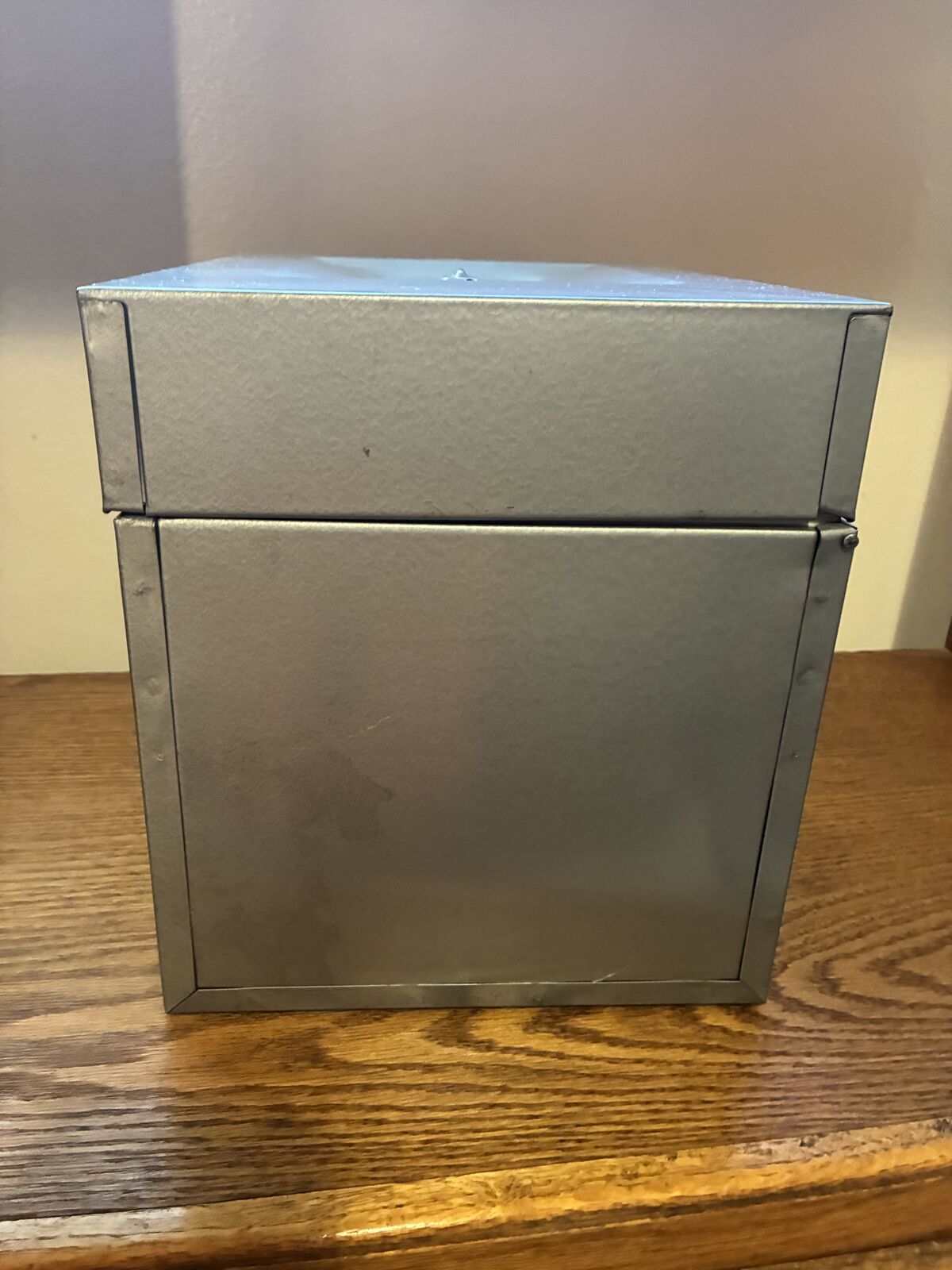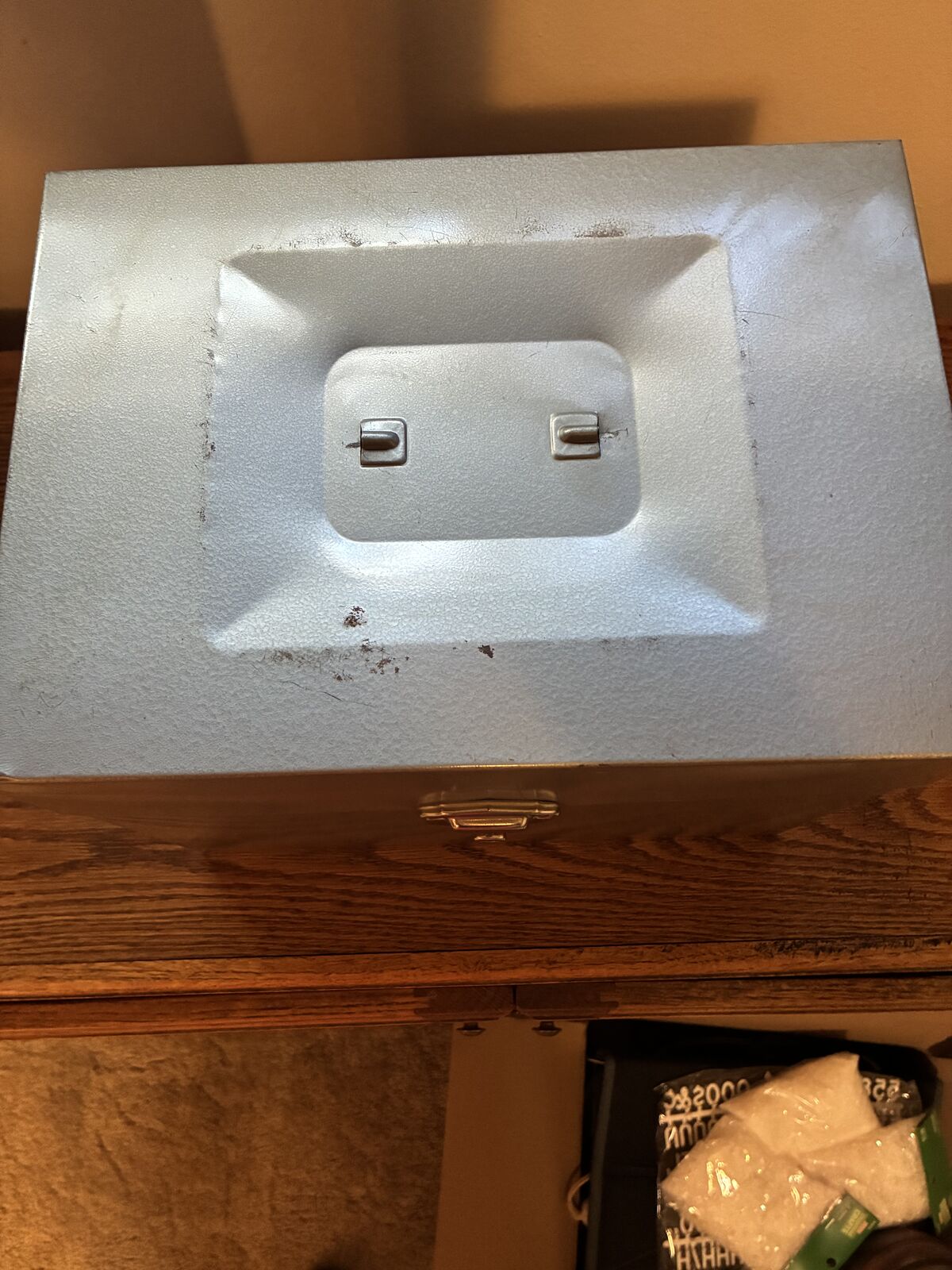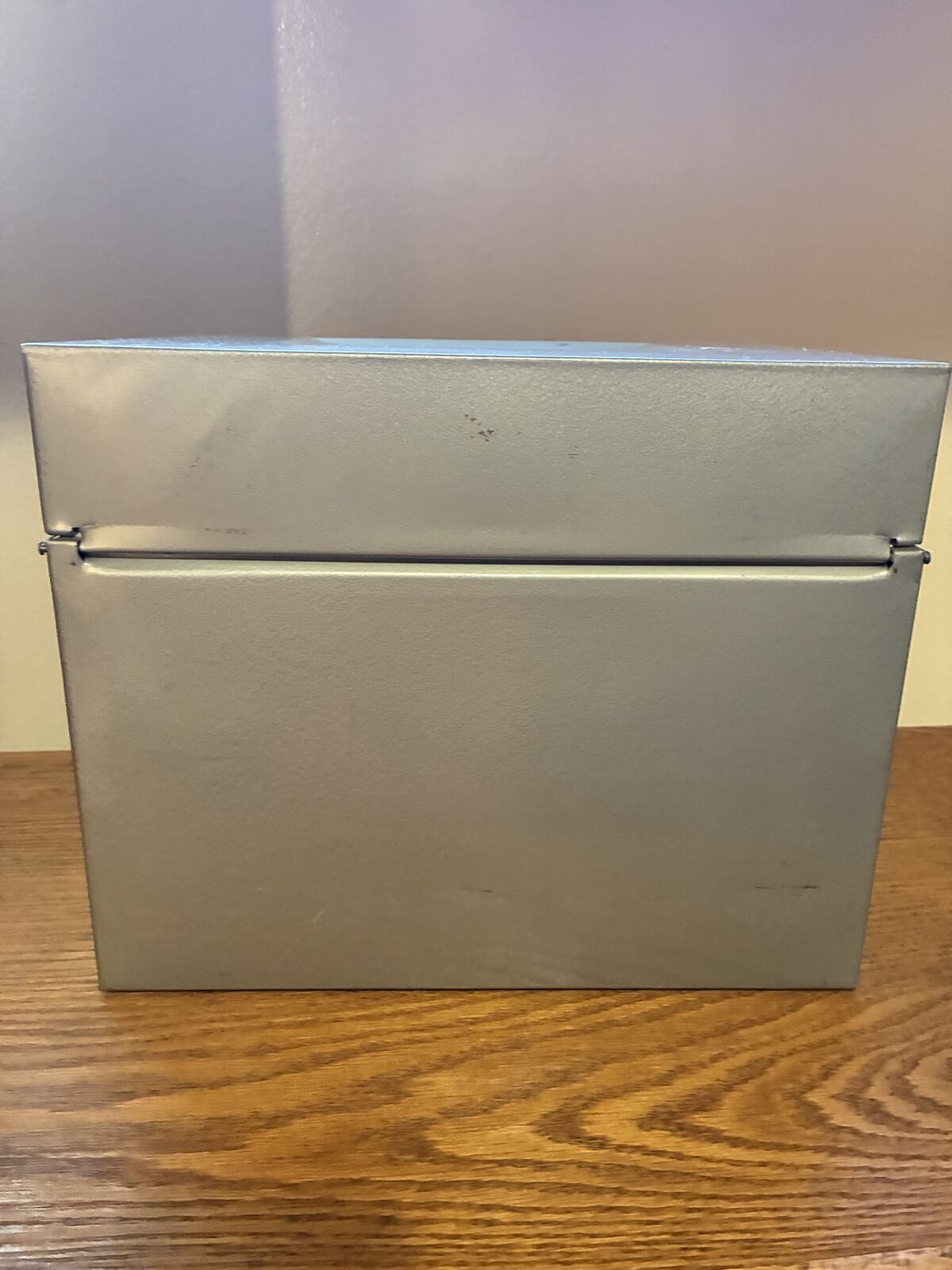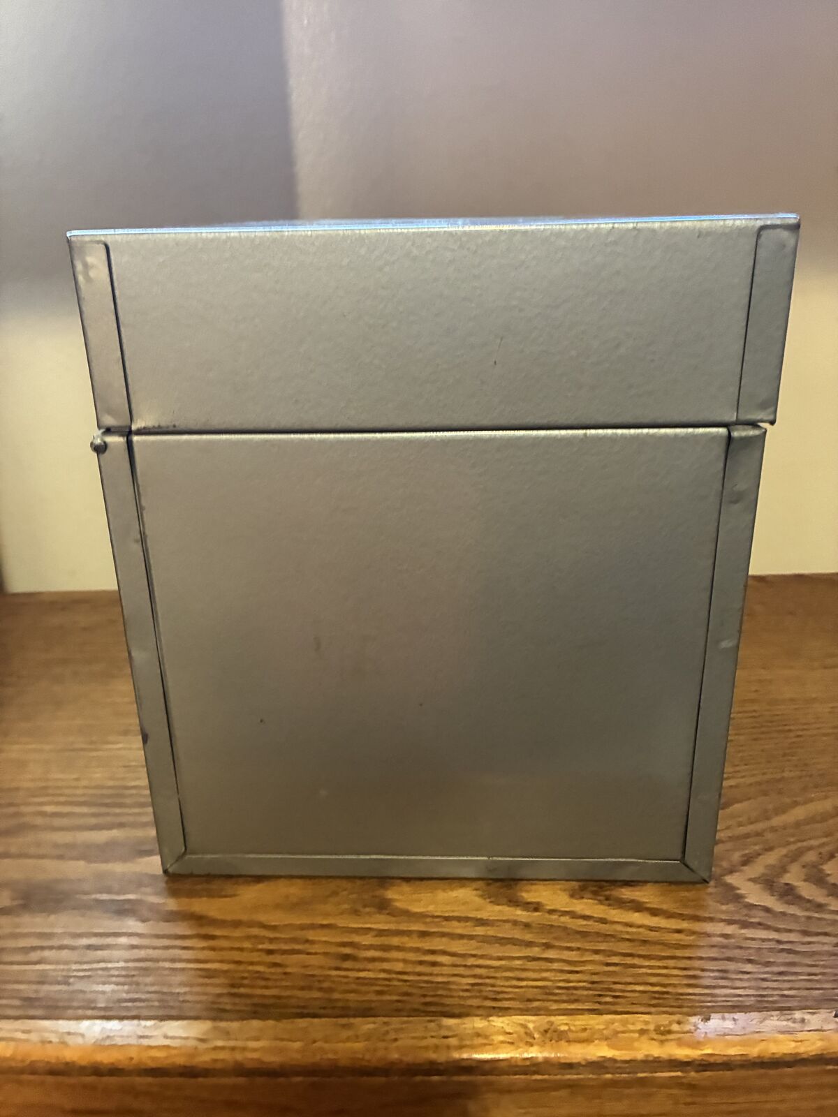 Venmo1960’s Porta-File lock box “makers of the famous Scotch Kooler”. No handle, no key but a key is not required to close and open. If you push the key hold down it releases the lock. Good condition some rusting/wear and and minor dents on top.