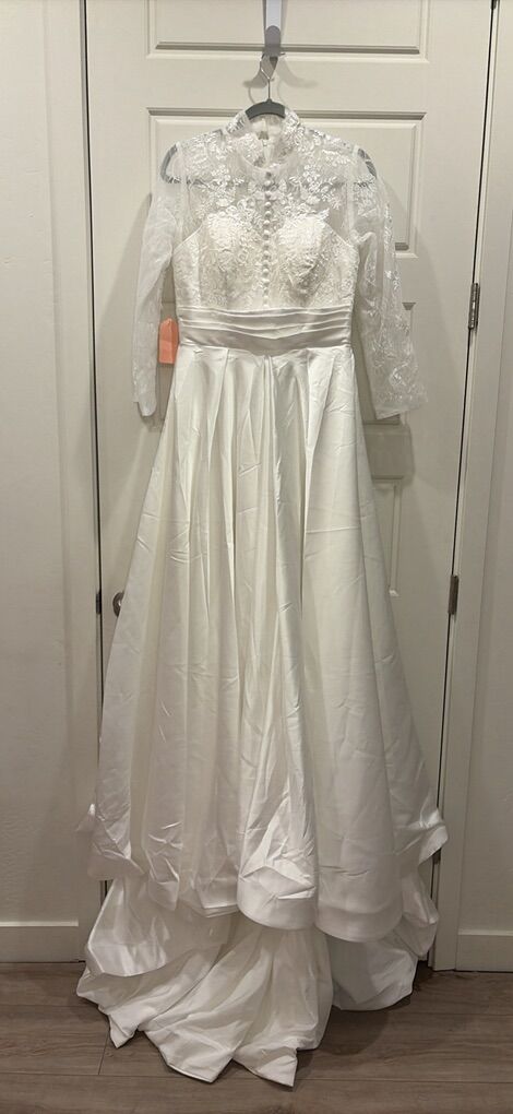 This satin skirt with a lace bust and hints of shimmer is stunning! Collar with three quarter sleeves! New! Size 10