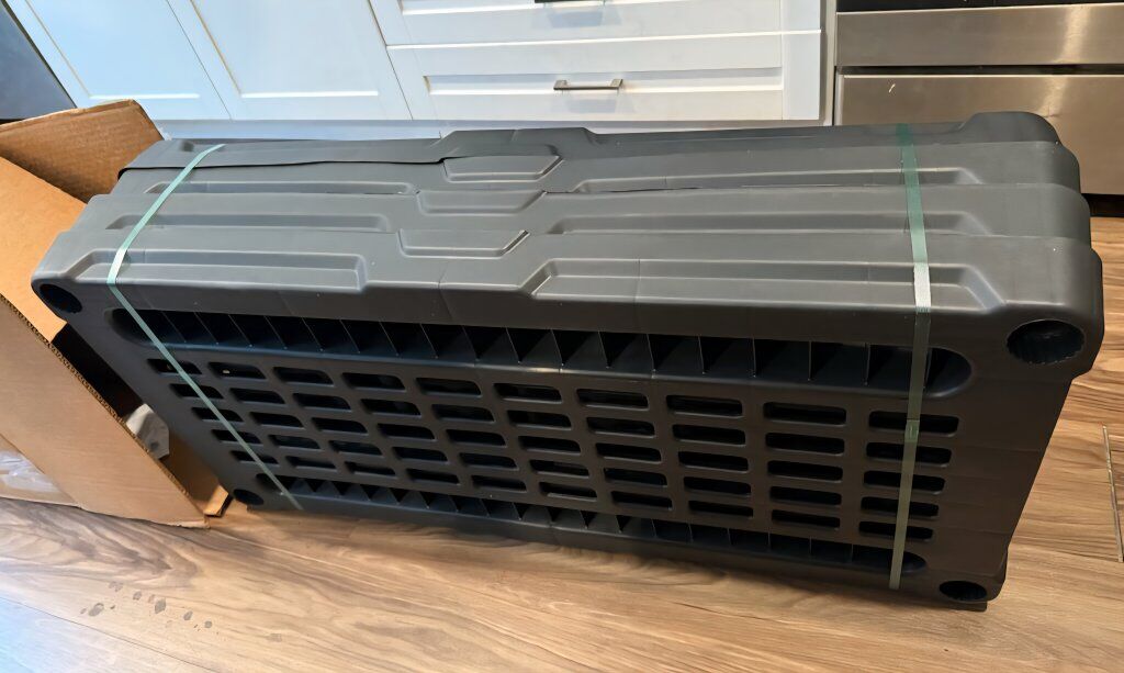 4 shelves 18 x 36 made of sturdy plastic. Great for Laundry room, Storage room, or Garage. New, in the box.