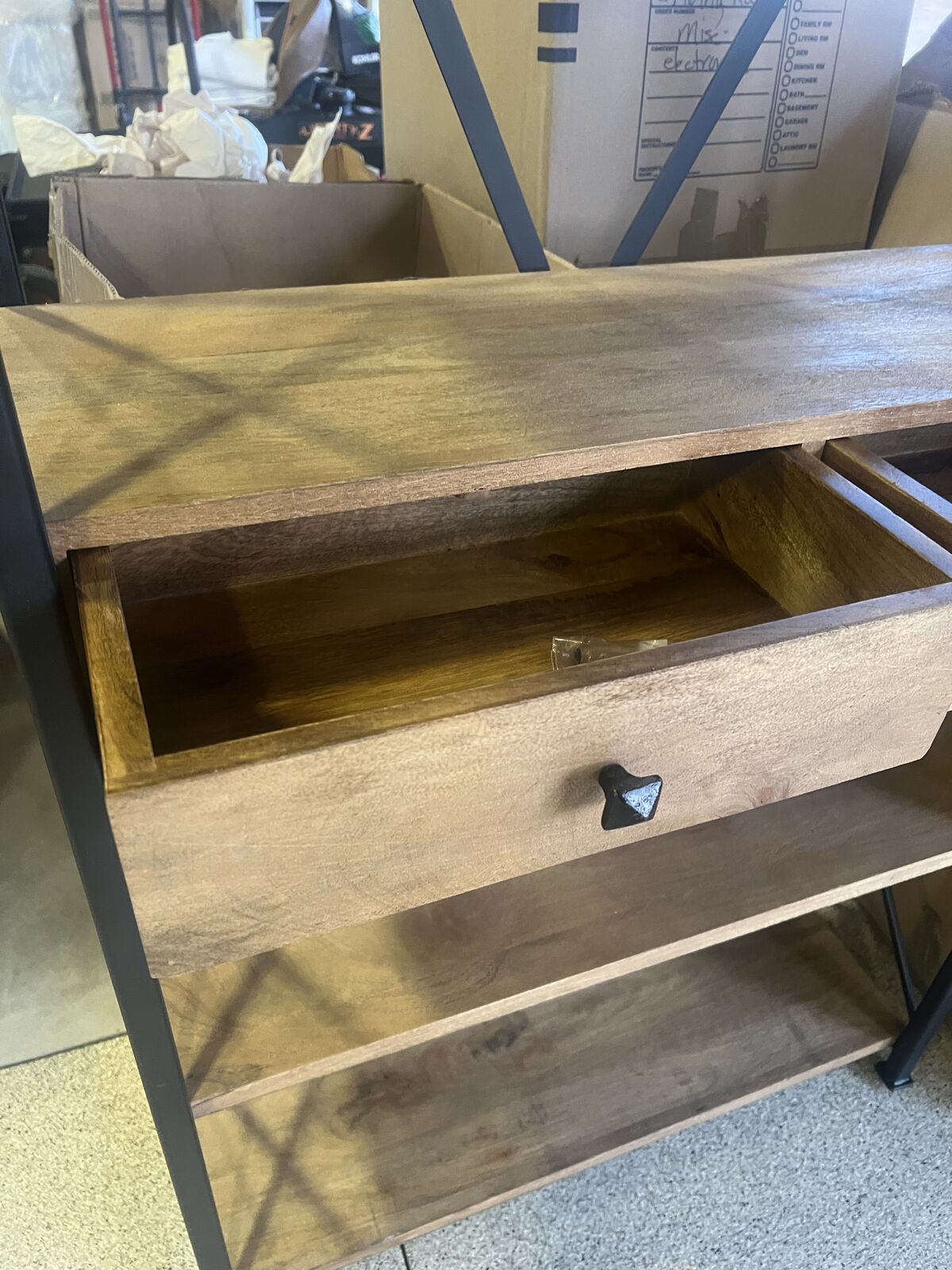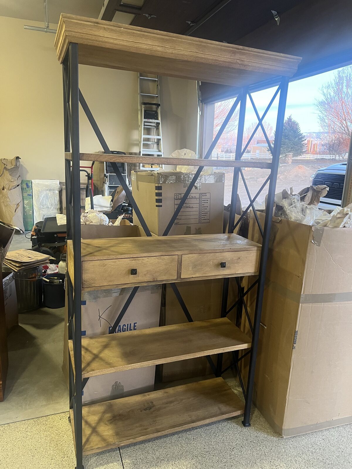 Has four large shelves, including one with two roomy drawers, it's an ideal focal piece for any home. Drawers are clean and were never used.