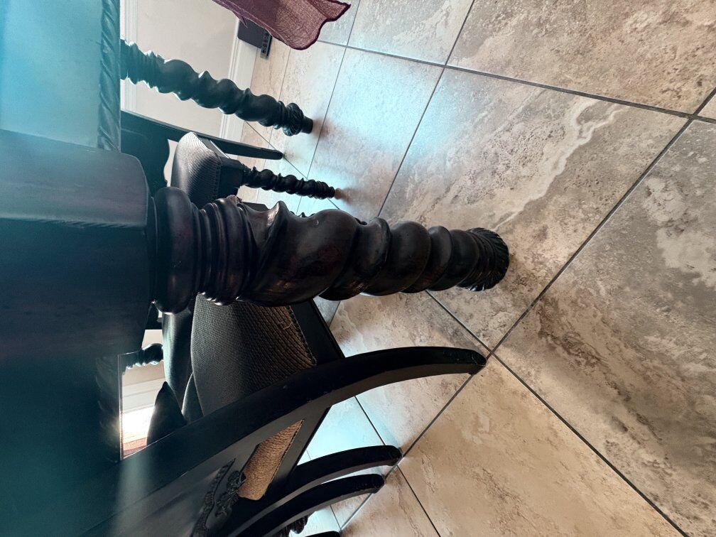 Solid Wood Dining Table Set – 8 Chairs + 2 Leaf Extensions Beautiful dark wood dining table with detailed carved legs and matching high-back chairs. Comes with 8 chairs and 2 leaf extensions to expand for larger gatherings. Perfect for holidays, big family dinners, or entertaining. • Solid, heavy, and very sturdy • 8 upholstered chairs included • 2 removable leaf inserts • Classic, elegant look Great condition with normal wear from use. Pickup only.