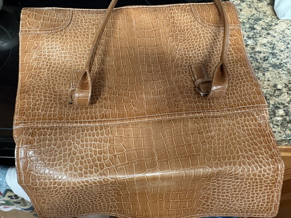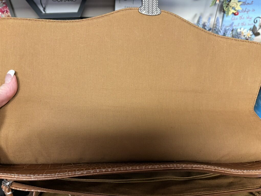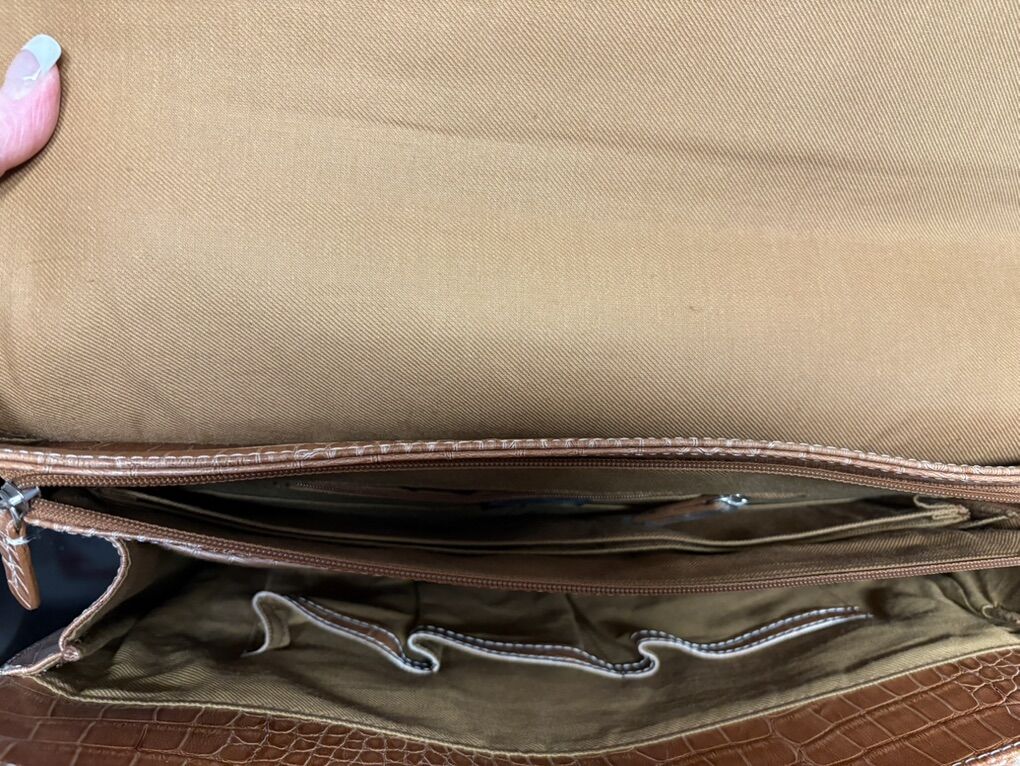 New Liz Claiborne brown or tan crocodile-embossed briefcase, laptop case, or satchel bag. It features a faux or genuine leather exterior, silver-tone hardware, and a turn-lock closure on the front flap.