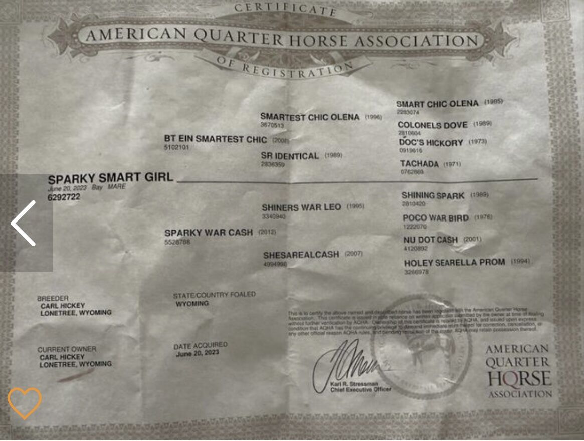 I have visited with AQHA and the individual who raised her and they are trying to work out the details. However, I don't have the patience or time to deal with getting this fixed so selling as grade. She does have Smart Chic Olena and Docs Hickory in her lines as the DNA on the sire is correct. She is also 6 panel negative. My loss your gain as this is a really athletic and cute filly. Price reflects the AQHA mishap!