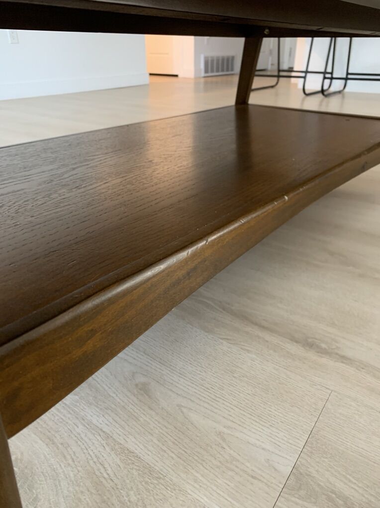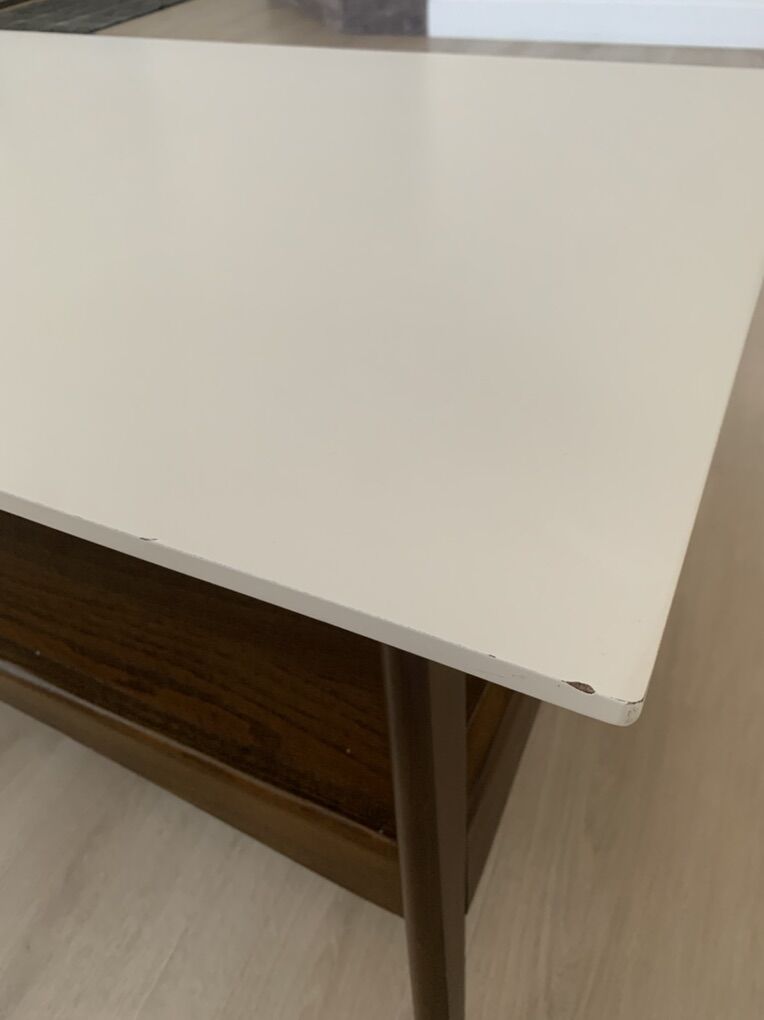There are a couple small nicks if you’re really looking for them — purely cosmetic and could be an easy touch-up. The wood on the bottom is in amazing shape.