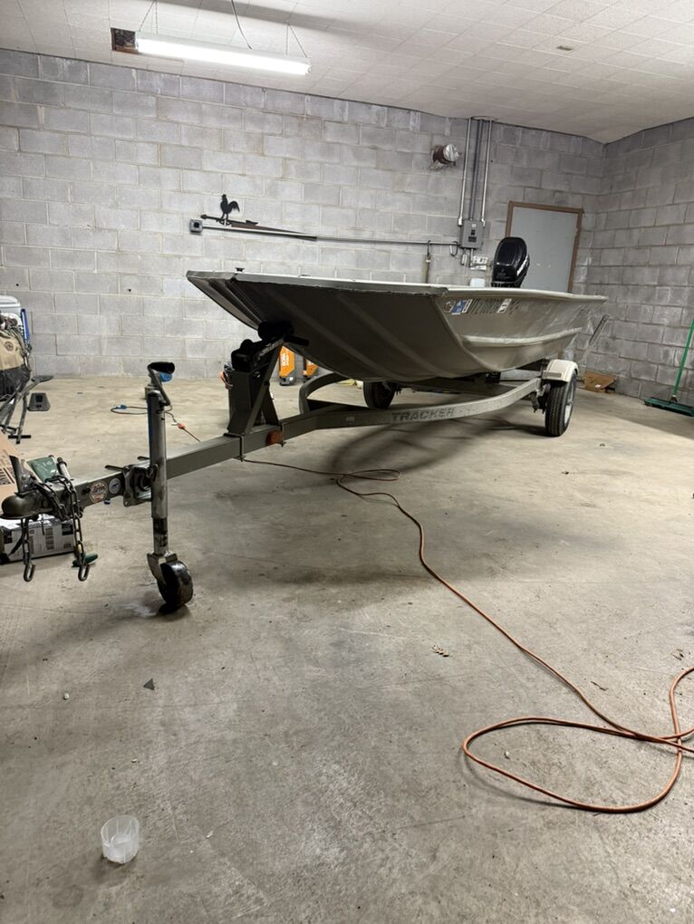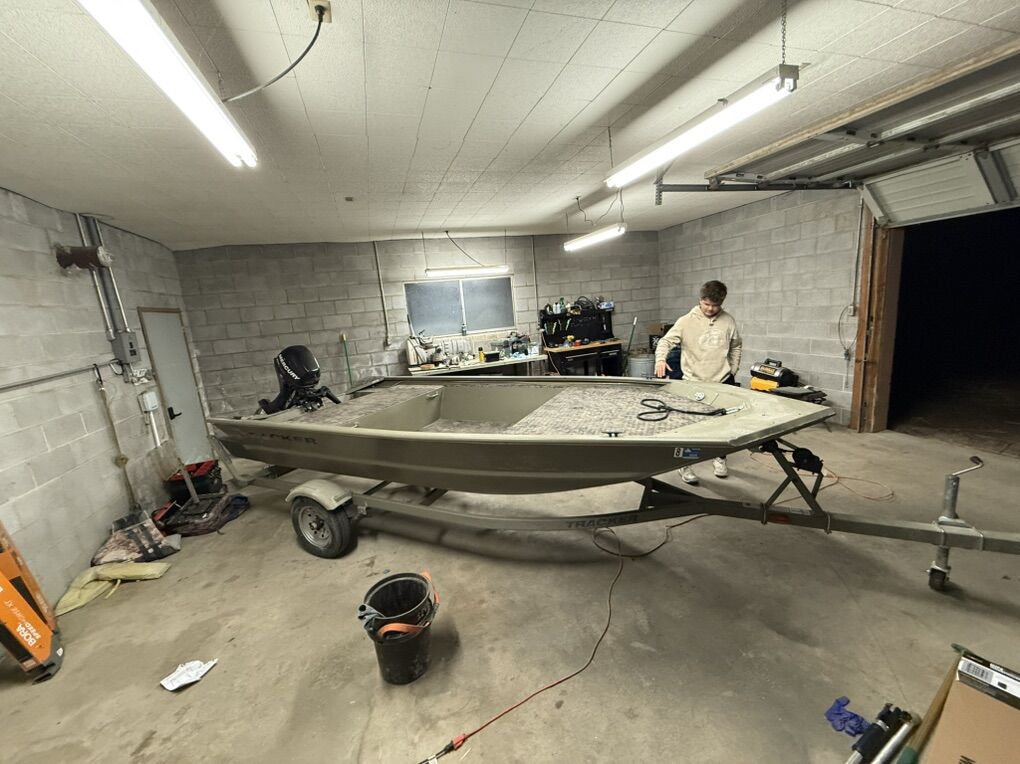 VenmoTracker Grizzly 1448 w/ Welded Pods & 2012 Mercury 9.9 Pro Kicker – Low Hours Great running setup and ready for the water no holes or leaks Tracker Grizzly 1448 with professionally welded pods for added stability. Powered by a 2012 Mercury 9.9 Pro Kicker with extremely low hours. Includes transom saver. This boat was previously set up for duck hunting and bowfishing. The lights have been removed (as shown in photos), but wiring is still there. It has foam decking, though it could use a refresh if you want it perfect. Foam flooring was removed to reduce weight. Recent Maintenance: Motor fully serviced New impeller New gas tank Lower unit gear oil changed Engine oil changed Trailer bearings redone Tires rotated Trailer lights work properly. Interior lights are installed but will need a battery to operate. Tires are in good condition. Clean setup overall and runs strong. $6700 OBO Open to trades — let me know what you have. Titles for both boat and trailer in hand. I also have additional videos of the motor running and lights working — just message me if you’d like to see them.has been a awesome boat will be sad to see it go Tracker grizzly Jon boat duck boat fishing boat bow fishing boat