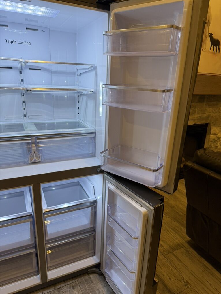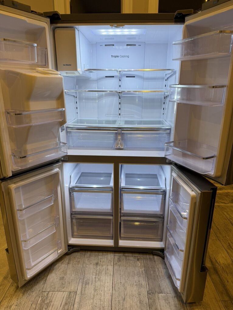 VenmoSamsung RF23J9011SR counter depth stainless steel. 4 door fridge with in door water and ice dispenser. Top part is a fridge. Bottom left is always a freezer. Bottom right can be set to either fridge or freezer depending on what you need. 23 cf.