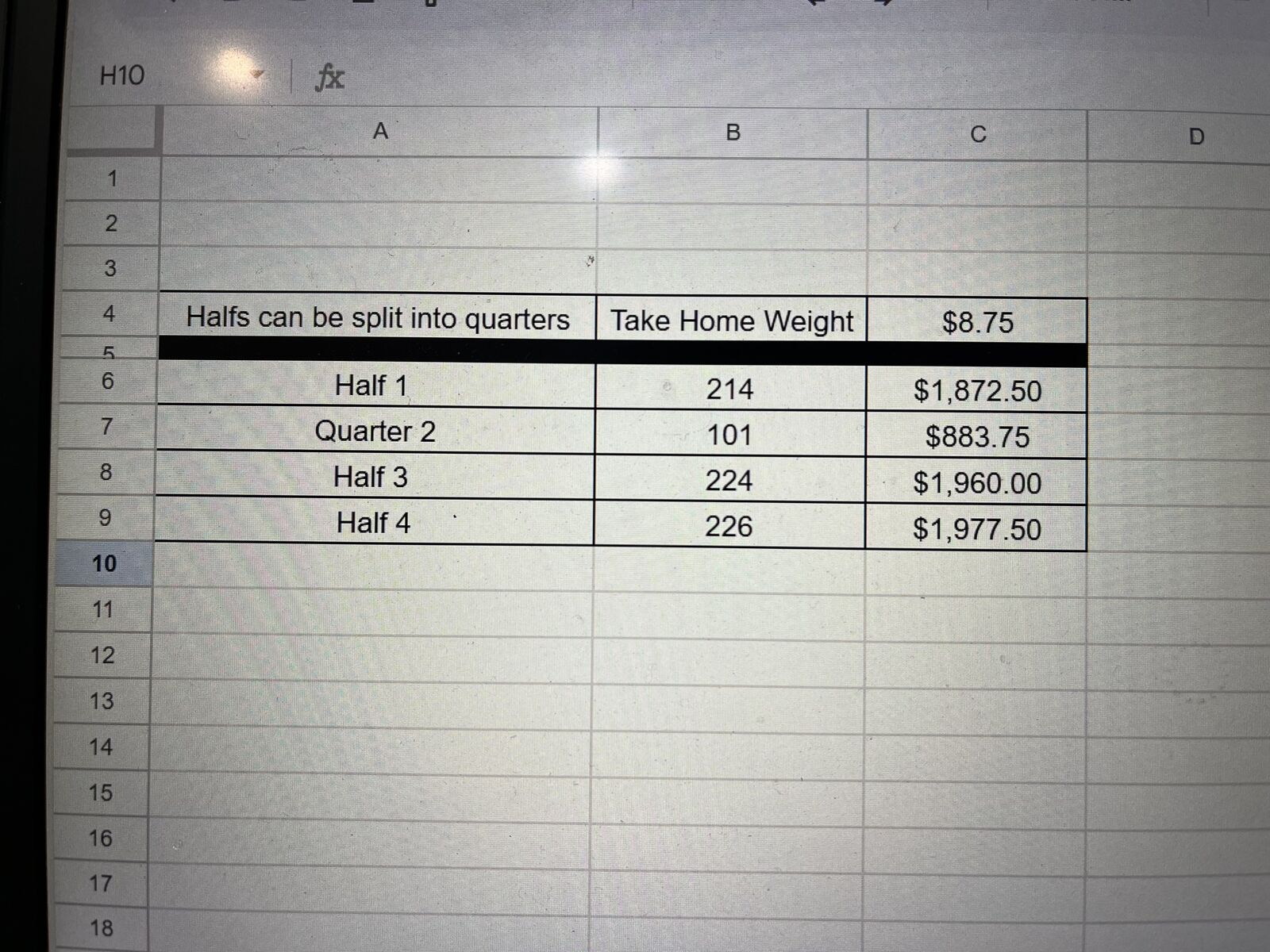 $8.75/lb on Finished/take home weight. This includes all processing costs.