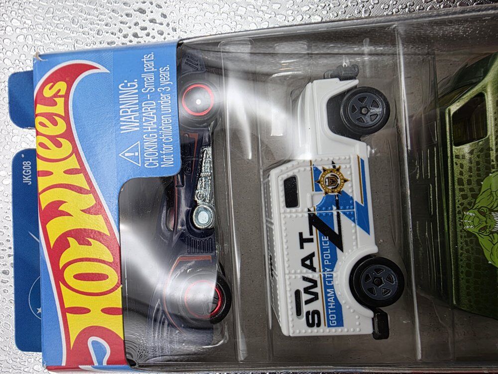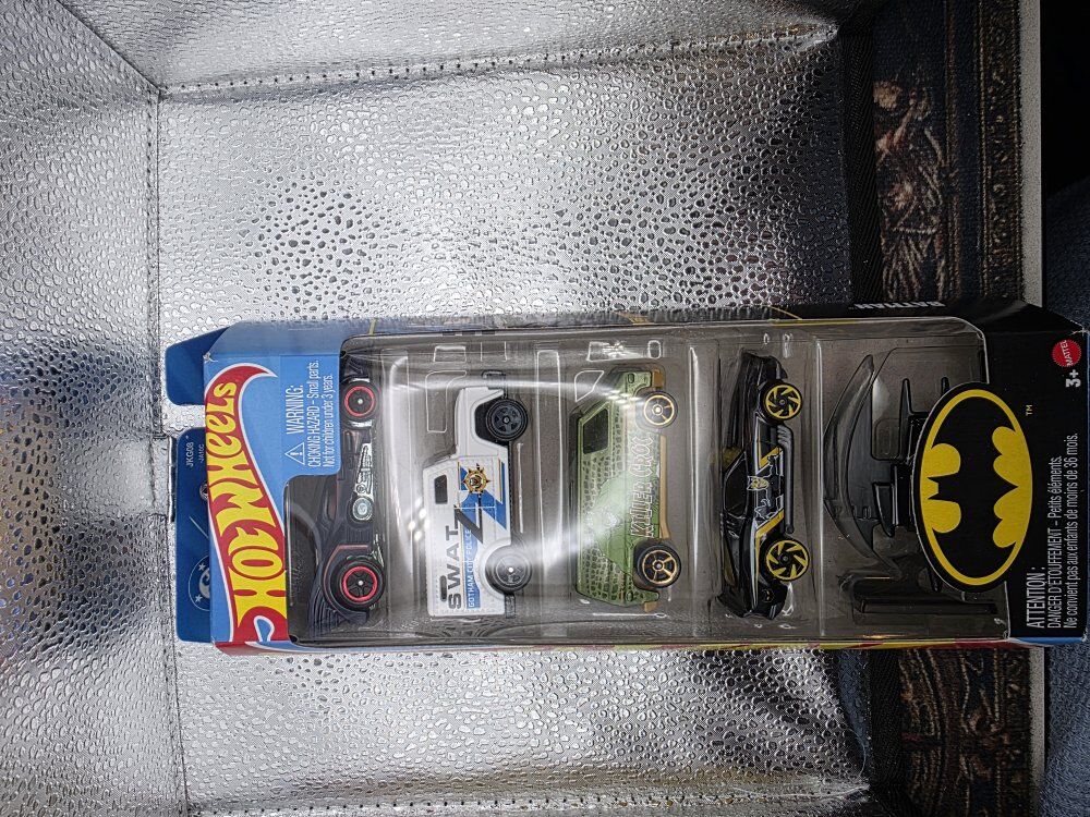 ZelleThis is for 1 Semi-Truck, 1 60's model Batmobile, 1 Monster Truck Camo Tumbler and 1 pack of 5 Batman cars as shown in the pictures HYT56 Hot Wheels 2025 DC, Justice League, Super Friends Track Fleet Semi-Truck and Trailer has Batman, Superman, Wounder Woman, Green Lantern, Flash, Cyborg, and Aquaman on the trailer. 1;64 scale (has soft edges and card imperfections, but still in good condition please see photos)