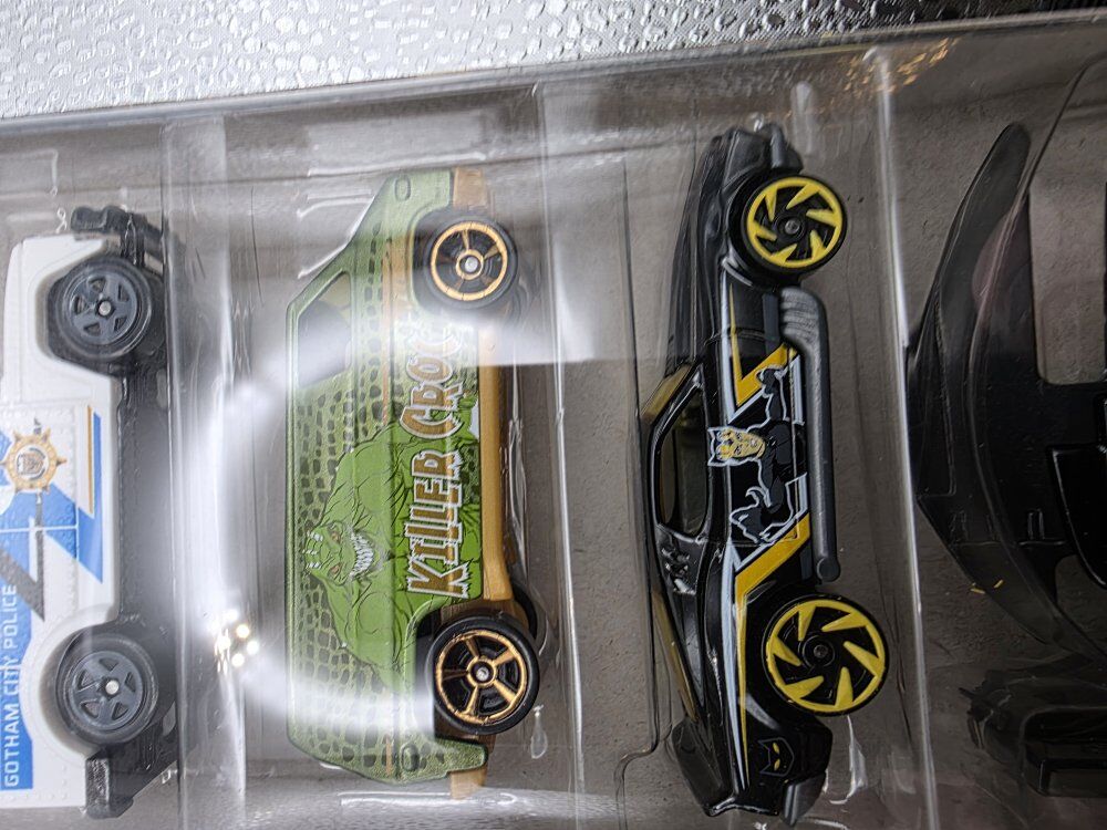 JKG08 DC, Batman pack of 5 Vehicles (has the 1989 Batman movie Batmobile From the Michael Keaton Batman Movie but it is purple (to me) and Red Trim with Red around the wheels)( very hard to find this Batmobile) From top to bottom its the Batmobile, Gotham City SWAT Z Armored Truck / Camion Blinde in white, Killer Crock 70's Van / Fourgonette, Cat Woman's Blvd. Bruiser in Black and gold/yellow, and the Bat Plain in all black with stand. Super Cool Set!!